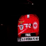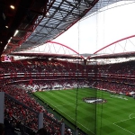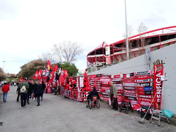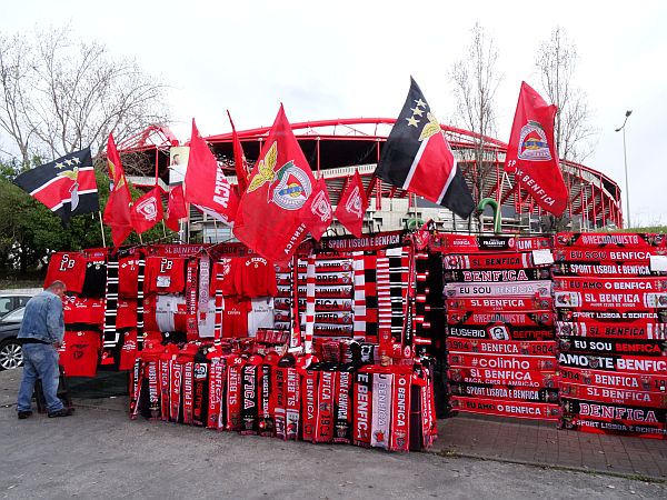 Nach einem weiteren Schöppchen an einem Stand, der auch Bifanas und ähnliches verkauft (wobei wir den wartenden Portugiesen vorgezogen werden) brechen wir auf. Es ist zwar noch früh, doch die angekündigten Kontrollen lassen schlimmes befürchten und wir sehen zu, dass wir vor dem Fanmarsch im Stadion sind. Die Fahnen der Händler wehen vor dem Stadion, wir erstehen einen recht kurzen Spieltagsschal und quetschen und durch eine enge Vorkontrolle zum offiziellen Einlass. Es dauert keine fünf Minuten, bis wir die Kontrolle erreichen, die ordentlich aber nicht unangenehm ist, einzig Ariane wird durchsucht als wir eintreten und sie wird auch noch durchsucht, als alle anderen die Kontrolle passiert haben. Sie wird auch noch durchsucht als wir warten, ihre Gesichtszüge sprechen Bände. Doch irgendwann darf sie auch durch, unsittlich berührt und peinlich betroffen. Oben trennen sich unsere Wege, die einen müssen Richtung Block 33, Pia und ich wandern hoch in die 28. Hoch die Stufen – und da ist er: Der Blick auf den Rasen des Estadio da Luz, dem Stadion des Lichtes. Eintracht Frankfurt international.