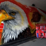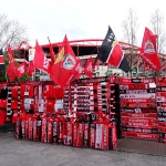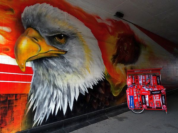 Oben sitzen schon Julian und Julian, die uns auch in Mailand ein Stück des Wegs begleitet hatten – doch ansonsten blicken wir auf viele freie Plätze im roten, weiten Rund, das sich nur langsam füllt. Auf den Sitzen liegen für uns weiße Shirts bereit – eine weitere kleine Choreo, vorbereitet von den Ultras, deren Fahne auch schon im nebenan liegenden Block hängt. Aus den Boxen pluggert in angenehmer Lautstärke Musik der 80er, Chris Reas „Road to hell“ wird zur „Road to nowhere“ von den Talking Heads, so zieht die Zeit ins Land, immer wieder ein „Gude wie“ hier und ein „Alles klar“ dort. Ich spaziere runter zu den Toiletten, nebenan gibt es bleifreies Bier und einen Hot Dog zu sieben Euro, lasst mal stecken. Polizisten verhindern, dass du zu nah an den Rand gehst, um das Treiben an den Eingängen zu überblicken. Mittlerweile haben es auch Maj und Jasmin zu uns geschafft und zwei Reihen hinter mir sitzt Özi samt Gattin, der vor vielen Jahren bei den Eintracht Amateuren kickte als ich Stadionsprecher war und heute im administrativen Bereich beschäftigt ist. Etwas später treffe ich unten auf Izet, dem ich noch eine Karte besorgen konnte (Danke Lukas), ich lotse ihn zu uns nach oben, während sich der Adler von Benfica anschickt, seine Runden zu drehen, majestätisch kreist er in der Höhe, doch statt im Mittelkreis zu landen, nutzt er die Gelegenheit für einen Ausflug in die Freiheit – und ward vorerst nicht mehr gesehen.