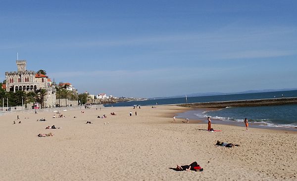 Raus aus den Federn, die Sonne lacht. Unser heutiges Ziel lautet Cascais, ein Ort am Atlantik, leicht zu erreichen mit einem der Vorortzüge, für die du eine spezielle Tageskarte brauchst, aufzuladen an den klassischen Automaten, Kostenpunkt 10,40 Euro. Izet kommt zu uns runter, wir frühstücken und fahren dann runter zum Cais do Sodré. Von hier fahren die Fähren über den Tejo, von hier fahren auch die Bahnen nach Cascais – und wir wissen: Den schönen Fensterblick auf den Tejo hast du, wenn du in Fahrtrichtung links sitzt. Dies klappt tadellos und schon rollt die Bahn an, wir rollen an Belem vorbei, am Denkmal, am Torre de Belem, halten alle naslang, vor unseren Augen schiebt sich der Tejo in den Atlantik, vor unseren Augen offenbart sich das Meer, es schmeckt nach Sommer. Hinter Estoril liegt Cascais, wir steigen aus, schlendern durch den Bahnhof in die belebte Fußgängerzone, die Tische sind besetzt, Urlaub.