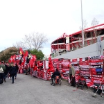 Oben am Martim Moniz treffen wir auf Vatmier und Steffen, die auch glücklich und begeistert unterwegs sind, auch Sabine kommt uns entgegen und wir treffen tatsächlich noch ein paar Schritte weiter oben unsere Frankfurter Vermieter. Die Welt ist doch ein Dorf und mit zwei kleinen Sagres in der Hand, sitzen wir nur wenig später auf der Terrasse und bewundern die Häuschen der ansteigenden Alfama und dann ist endgültig Matchday. Mit der roten Linie geht es runter zu Baixa-Chiado und dann umsteigen in die blaue Linie zur Haltestelle Colegio Militar/Luz. Die Bahnen sind schnell getaktet, die Wartezeit wird digital angezeigt, ein effizientes System bringt uns hoch zum Stadion, schon beim Aussteigen sehen wir die roten Träger in rechter Nähe in die Sonne leuchten. Direkt vor unseren Augen wächst ein riesiger Komplex in die Höhe, der Verkehr rauscht und wir nutzen die Gelegenheit für einen kleinen Abstecher in den gigantischen Supermarkt im Einkaufszentrum, leider sind fast alle Getränke ungekühlt – bis auf einen kleinen Heineken Kühlschrank, acht winzige Fläschchen für 4 Euro, das ist besser als nichts. Und kaum stehen wir wieder vor dem Zentrum, fallen wir in die Arme von Niko und Ariane, von Marc und Maria, auch Michael ist dabei, wir könnten so auch am Gudes in Frankfurt stehen. So ploppen die kleinen Heineken auf, Prost ihr Helden, auf die Eintracht.