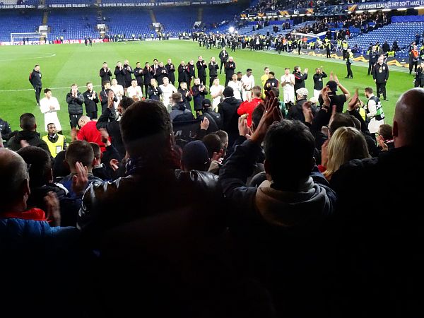 In der Pause hält Pia das Eintrachtfähnchen nach oben, bis ihr die Arme fast abfallen, aber sie hält durch. Dann ist es Gacinovic, zu Jovic – und er trifft, wir drehen durch. Chelsea spielt bei weitem nicht so stark wie im Hinspiel, die Eintracht bleibt dran, ich bin sicher, das verlieren wir heute nicht. Und es geht tatsächlich in die Verlängerung, kurz zuvor wurde Haller noch eingewechselt. Und weshalb Azpilicueta noch auf dem Platz steht, wissen die Götter. Mit beiden Beinen voraus auf Gacinovic, das war eigentlich glatt rot. In der Verlängerung hat die Eintracht wieder ihre Chancen, Luiz rettet auf der Linie. Und dann liegt der Ball im Tor. Wie, das konnten wir nicht erkennen, aber er ist drin. Trapp hatte ihn doch schon und jetzt: 2:1 für Chelsea, der Traum ist aus. Doch der Schiedsrichter sieht mehr als wir, annulliert den Treffer, wir können alle eigentlich nicht mehr. Und doch geht es weiter – bis zum grausamen Elfmeterschießen. An der Stamford Bridge. Bei Chelsea. One step to Baku. Direkt vor unseren Augen. Das komplette Tor können wir nicht sehen, alles steht. 3:1 führt die Eintracht, Chelsea verkürzt. Dann Hinteregger, Hinti Army, läuft an, die Blauen jubeln. Noch ist alles drin, weiter, weiter. Die Blauen jubeln wieder. Dann ist es Goncalo Paciencia, der uns bei Benfica die Hoffnung am Leben hielt, er läuft an, schießt, das Netz bewegt sich nicht. Jetzt liegt es an Kevin Trapp, Hazard läuft an, das Netz bewegt sich, die Blauen rennen umeinand – die Eintracht ist raus. Für einen kleinen Moment steht die Zeit still, wir realisieren das Ende der Reise. Abschied.