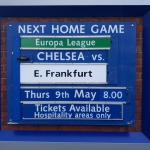 Gegen 15 Uhr machen wir uns auf, in der Hand ein Dosenbier, den Eintrachtschal um den Hals, geht es zu Fuß die North End Road nach unten. Der ein oder andere Pub bietet nur Platz für Heimfans, das kann uns aber egal sein. Sicher verstaut liegen die Tickets in der Tasche, nach dreimaligem Überprüfen wissen wir das ganz genau. Ein alter Doppeldeckerbus schiebt sich an uns vorbei, „Zuhause in Europa“ weißt das Schild aus, wo sonst die Endstation angeschrieben steht. Aber hallo. So wandern wir langsam vor zum großen Einkaufscenter neben dem Stadion, überall drücken sich jetzt Eintrachtfans durch die Wege, wir nehmen Dosenbier und zur Sicherheit eine Plastiktüte, teilen das Bier mit einem Eintrachtfan und stellen uns ans Eck. Und ab jetzt heißt es überall Gude wie. Tausend Begegnungen, tausend Gespräche, tausend Geschichten. Gerd konnte wie Vatmier noch eine Karte ergattern, Jürgen war überall dabei, und die Polizei lässt uns in Ruhe. Naja, erstmal, irgendwann kommt einer vorbei und nimmt uns freundlich aber bestimmt die letzte Dose ab. „Enjoy the game“. Machen wir, holen uns aber zuvor noch ein weiteres Bier, trinken die Dose aus der Plastiktüte, überwinden die 40 Pence Toilette im Einkaufszentrum hoch geschickt und ausgeklügelt, da uns die Münzen ausgegangen sind. Und dann müssen wir unbedingt noch Familie Minden treffen, die wir überall getroffen haben. Nur nicht in Lissabon. Und prompt setzte es eine Niederlage. Dank moderner Technik klappt das auch tadellos, jetzt ist Gewimmel und Gewusel, Lukas stößt zu uns, da ist auch Anno und ehe wir uns versehen, sind wir im Stadion, das ging ja entspannt und flott.