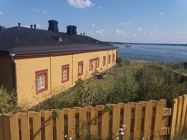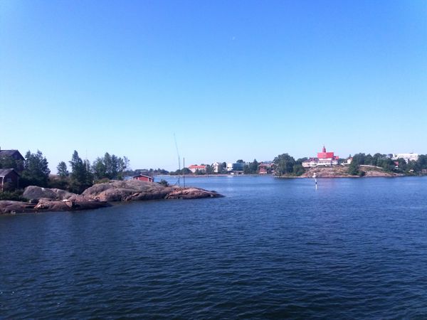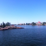 Mal schauen, ob alles so klappt. In einem Supermarkt am nahen Bahnhof hole ich mir Croissants und einen Smoothie und wandere durch geschäftige Viertel mit großen Einkaufshäusern Richtung Markt. Dort locken orangene und weiße Sonnenschirme zu den Ständen, Klamotten und Gemüse, Souvenirs und Rentierfrikadellen im Angebot. Die Fähre, die alle 20 Minuten nach Suomenlinna ablegt, wartet schon auf die Abfahrt. Ich ziehe mir eine 24 Stundenkarte und kaum bin ich an Bord, tuckern wir los. Es wird ein heißer Tag – und heiße Tage auf einer Insel sind bekanntlich die besten. Der Blick fällt auf die vielen Inseln, winzig klein zum Teil, manche scheinen bewohnt, Menschen sitzen in ihren kleinen Häuschen, Bootchen tuckern umher, der Fahrtwind zerzaust die Haare, bis wir nach einer guten Viertelstunde anlegen. Kaum an Land, wird mir eine Karte in die Hand gedrückt und während sich der Rest der Mitreisenden Richtung Hauptweg aufmacht, biege ich am Ufer entlang ab. Noch ist wenig los, immer wieder fällt der Blick aufs Wasser, dazwischen Wege und hölzerne Häuser, kaum Autos und Inselruhe. Schön ist’s hier, über eine Brücke geht es auf den hinteren Teil der Insel. Ein Kiosk verkauft Souvenirs, hier scheint das kleine Zentrum von Suomenlinna zu sein, ich spaziere weiter am Wasser entlang. Auf Steinfelsen sitzen vereinzelt Leute, eine Fähre schiebt sich vorbei, etwas zu groß für die kleinen Segelbootchen dazwischen, ich setze mich alleine auf die Steine und sehe den Schiffen hinterher, träume aufs Wasser zwischen Bullerbü-Feeling und Europacup, zwischen Sonnenschein und dem Unterwegssein und dem Gedanken, dass irgendwann alles so nicht mehr sein wird.