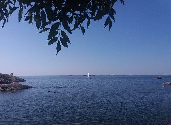 Jetzt warten schon nahezu hunderte auf die nächste Fährfahrt, schwitzen stehend in der Sonne – welch Glück, dass ich so zeitig unterwegs war. Durch die wunderbare Markthalle wandere ich am Olympia Terminal vorbei am Ufer entlang Richtung Fährhafen für die Fähre nach Tallinn. Morgen um 10:30 wird es von hier weiter gehen, vielleicht ist es von Vorteil, dann die Wege zu kennen, um die Fähre rechtzeitig zu erwischen. Zudem ist weit schöner, am Wasser entlang zu schlendern, als durch die heiße Stadt zu treiben. Bis zum kleinen Strand Eiranranta ist es ein wunderbarer Weg, ab dann wird es holprig, die Fährkanäle sind zu umlaufen, Baustellen versperren kurze Wege und es dauert eine ganze Weile, bis ich den Zugang zum Terminal 2 erreiche. Bis ganz nach unten laufe ich nicht, aber ich weiß nun, dass zwei Straßenbahnen vom Bahnhof bis dorthin fahren, der morgige Weg ist überschaubar und so nehme ich eine Bahn und fahre zurück in die Stadt. Weiter oben ist eine weitere kleine Insel, Seurasaari, und dieser Ort klingt ebenso verheißungsvoll wie Suomenlinna. Ich wechsle die Bahnen in denen ich schwitzend aus dem Fenster schaue und wenig reizvolles entdecke, verliere leicht die Orientierung, nehme eine Bahn zurück, da die Nummer 4 zwar an der gleichen Station hält, jedoch einige Meter weiter unten, was ich zunächst nicht gesehen habe, finde die richtige Haltestelle und steige spontan an einem Park aus, von dem ich vermute, dass ein Weg durch diesen Richtung Seurasaari führen könnte. Und tatsächlich, einem inneren Gefühl folgend (und einem Blick auf die Karte dazu) entdecke ich Wegweiser, die mich zur Brücke führen – und schon bin ich am Ziel. Natürlich bin ich nicht alleine, aber schon nach wenigen Metern verspielt sich alles. Die einen wandern die Waldwege entlang, ich halte mich an den Uferweg, unterwegs treffe ich auf Sonnenanbeter und Picknicker, und nach wenigen Metern erreiche ich einen kleinen Strand, Kindern spielen im Wasser wie gemalt. Ein paar Meter weiter oben hocke ich mich auf einen Stein an einer winzigen Bucht und halte die Füße ins Wasser. Urlaub. Ach wie schön, der Blick aufs Wasser, auf’s Grün, auf die umliegenden Inseln, die Boote und den klarblauen Himmel. Es sind diese kurze und kostbaren Momente, in denen du eins mit der Welt wirst, in denen die Zeit beim Atmen still steht, in denen nichts mehr von Bedeutung ist, außer dem nackten Dasein, noch nicht einmal das Denken. Und ich denke immer.