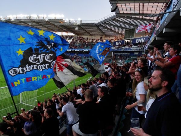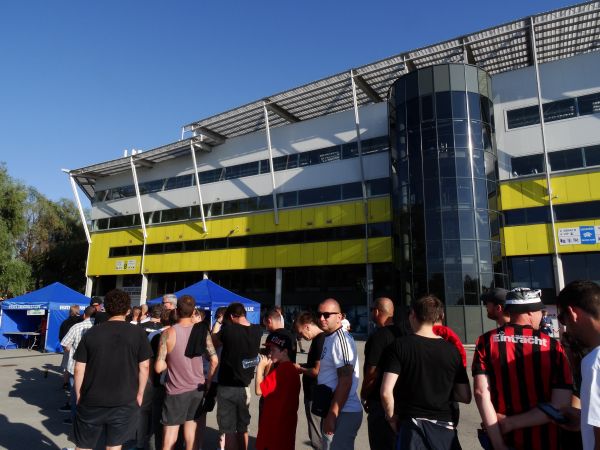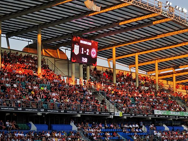 Als es losgeht, ist die A. Le Coq Arena ordentlich gefüllt, wir sind eine ganze Menge und machen ein mords Spektakel. Bei der Eintracht ist Wiedwald im Tor, der einzige Neuzugang in der Startelf ist Kohr. Auch an die neuen Trikots muss ich mich erstmal gewöhnen. Die Jungs von Flora in grün, es entwickelt sich ein munteres Spielchen, welches ich nicht sonderlich ernst nehme, zuviel gibt es zu erzählen, zuviel zu supporten, zuviel zu hören. Torro macht das 1:0, großer Jubel natürlich, Ausgelassenheit, bis der Ausgleich fällt. Der stört nicht sonderlich, wir holen Getränke, brüllen Eintracht und so vergeht auch die zweite Halbzeit in der untergehenden Sonne. Der eingewechselte Joveljic bringt die Eintracht erneut in Führung, wir stehen mittlerweile mit nacktem Oberkörper da und bleiben bis weit nach Schlusspfiff im Stadion. Im Herzen von Europa klingt auch hier schön.