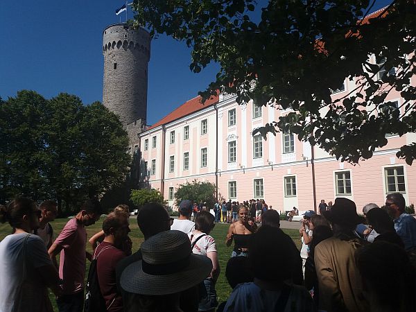 Am Kiosk entdecke ich oben am Fenster eine Eintrachtfahne, und treffe auch sofort auf die ersten Eintrachtler, jetzt kann das Fußballabenteuer beginnen. Hier ist Thorsten, der tausende Stadien gesehen hat, da Holger von den Schobberobbern, dort Tom von der Bembelbar, überall ein Hallo, ein Gudewie und Prost. Da ich morgen noch einen ganzen Tag in Tallinn vor mir habe, entscheide ich mich, ohne Ziel durch den Tag zu treiben, wandre runter zum Rathausplatz, treffe auf Maj und Yasmin, warte ewig auf einen Kellner, der sofort zur Stelle ist, als ich mir ein Kioskbier einschenke. Natürlich schimpft er, aber was soll ich machen? Ich order selbstverständlich bei ihm ein neues, wir sitzen und quatschen und sehen, wie sich langsam der Rathausplatz füllt, von hier wird der Fanmarsch abgehen – und kaum haben wir ausgetrunken, geht’s auch schon los.