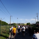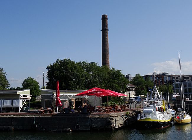 Unten am Bahnhof ein kleines Frühstück, dann kommt auch schon die Bahn mit der Nummer 7 angerumpelt und ehe ich mich versehe, werde ich auch schon am Terminal 2 ausgespuckt, der Ort ist unwirtlich und ich bin viel zu früh. In meiner Vorstellung sitze ich jetzt am Fährhafen und schaue den Fähren hinterher, in Wirklichkeit bin ich umgeben von Baustellen und Parkplätzen, Zeit zu rauchen. Und einen Aufkleber vom EFC Black & White zu entdecken. Da ich online eingecheckt habe, treibe ich mich eher sinnlos auf dem Gelände herum, bis ich den Durchgang passieren kann. Oben in der Wartehalle gibt es eine Terrasse mit Blick auf die Fähren, hier lässt es sich leichter Warten, unten reiht sich PKW an PKW, um auf die Fähre zu rollen. Es sind etliche Reisende unterwegs, Frankfurter aber entdecke ich kaum. Sobald das Boarding beginnt, schiebt sich eine lange Schlange auf die Fähre, es geht flott voran und kaum bin ich an Bord, beginnt das große Orientieren, Platz suchen. Menschen laufen treppauf, treppab so auch ich und es dauert ein Weilchen, bis ich das Sundeck gefunden habe, die Sonne gleißt, die ersten sitzen schon vor gefüllten Tellern, balancieren Gläser durch die Gegend. Auf dem Deck ein Kommen und Gehen, Plätze werden gesucht und gefunden, wieder aufgegeben. Ich setze mich an die Reling und warte auf’s Ablegen mit Blick auf die Helsinkier Kulisse. Immer wieder werden Fotoapparate und Handys gezückt, als ein Wind weht, realisiere ich, dass wir abgelegt haben, langsam verlassen wir den Fährhafen, immer kleiner wird Helsinki, immer näher rückt Tallinn.