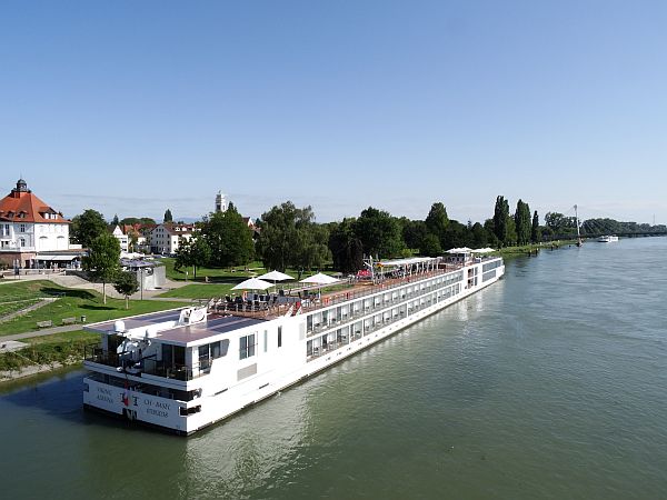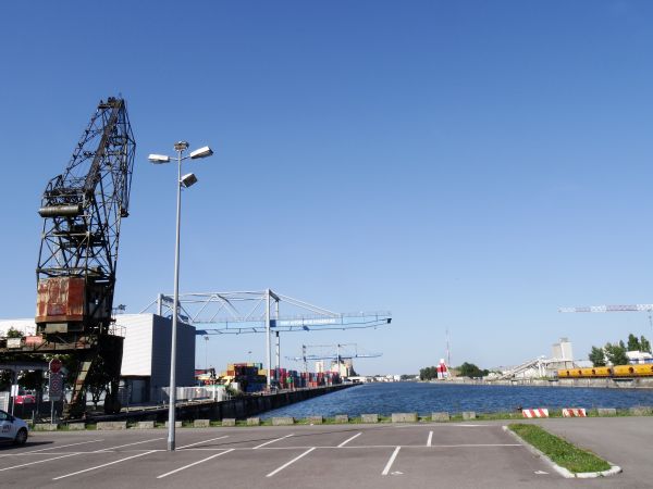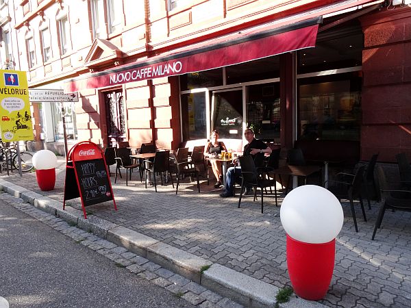 Kurz darauf spuckt uns der Bus in Kehl aus – mit der Ansage, letztlich vor dem Stadion auf uns zu warten, was ganz praktisch ist, da wir vorerst inkognito unterwegs sein wollten, im Stadion jedoch nicht. Und so machen sich Pia, Steffen und ich auf den Fußweg nach Straßburg, lassen Fanmarsch Fanmarsch sein und spazieren durch die Fußgängerzone. Mit einem Eis in der Hand geht’s über die Rheinbrücke, vorbei an einem kleinem Containerhafen. Die Sonne lacht, klarblau der Himmel und wir treiben per pedes Richtung Universtät, unbehelligt von Gott und der Welt. Unser eigentliches Ziel ist ja das Münster, aber der Weg zieht sich, so bleiben wir in einer Bar hängen. Zu Essen gibt’s zwar noch nichts, aber happy hour für Bier, der halbe Liter für 2,90 Euro, so setzen wir uns hin, treffen noch auf Annette und Bodo, schwatzen mit dem Wirt und nehmen dann die Straßenbahn Richtung Stadion, mit der wir dann auch für 1,60 hoch rumpeln.