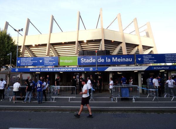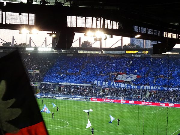 Das Stadion erinnert mich ein wenig an Bochum, das ist immer ein gutes Zeichen. Schon eine halbe Stunde vor Anpfiff singen wir uns in Trance, dies sollte mehr oder weniger bis zum Schlusspfiff und noch danach so weitergehen. Die Straßburger begrüßen uns mit einer blauen Choreo, dann raucht und blitzt es ein bisschen, inmitten wehen die Fahnen, zuweilen verdecken sie mir die Sicht auf’s Spielfeld, was ich ja gar nicht mag. Heute geht’s, die Atmosphäre passt. Ganz ausverkauft ist das Meinau Stadion nicht, aber alle die vor Ort sind, machen ordentlich Rabbatz, diesmal auch die Fans der Heimmannschaft, so etwas ist man ja gar nicht mehr gewöhnt. Es ist auf jeden Fall eine grandiose Fußballatmo, ein Leben für den Support würde Flo sagen, der heuer nicht dabei ist.