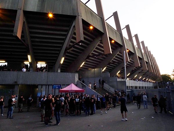 Da wir nicht genau wissen, wo unsere Plätze liegen, steigen wir an der ersten Haltestelle am Stadion aus und laufen geradewegs KSC und Racing Ultras in die Hände. Die lassen uns links liegen, wofür wir recht dankbar sind und spazieren hoch zum Gästeeingang. Unterwegs treffen wir natürlich noch die FUSSBALL 2000 Gang. Unser Bus parkt noch nicht im Käfig, sondern ein paar Meter entfernt, so trinken wir noch ein Schöppchen, ehe wir uns an der Polizei vorbei in den wahren Gästebereich schieben. Überall natürlich ein Gude wie, die Einlassnummer geht lässiger als gedacht, nur unser Block ist schon mächtig gefüllt. Wir schieben uns nach oben, stehen irgend wann im Weg, bis jemand ruft: „Hier ist noch Platz“. Prima, wir also hoch in die allerletzte Reihe und schon sind wir in bester Gesellschaft. Genau vor uns stehen Basti und Kristian, nebenan winkt Anno, daneben Filzi, hintendran Ernst und direkt neben uns steht der alte Bockenheimer Haudegen Tommy. Naja, ihr wisst ja wie das ist, kann mir die ganzen Pappenheimer ja gar nicht alle merken, die Woche für Woche unterwegs sind. Grüße an alle.