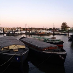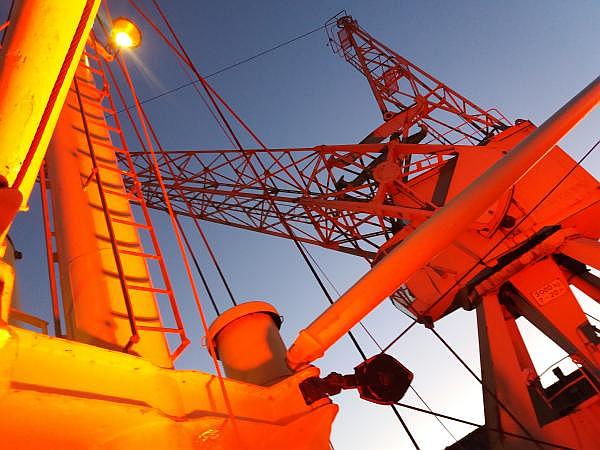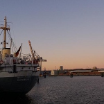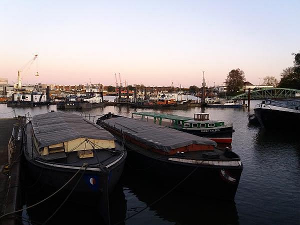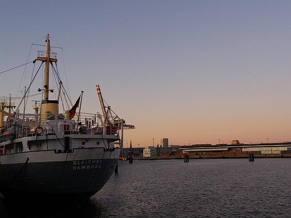 Dann machen wir uns auf zum Veranstaltungsort. Dieser befindet sich in einem altem Stückgutfrachter jenseits der Elbe liegend, die MS Bleichen. Zu Fuß scheint der Weg kaum machbar, wir nehmen an der Sternschanze die S-Bahn Richtung Veddel, überqueren die Elbe und müssen uns erst einmal orientieren. Zwei Hamburger Jungs erklären uns zumindest die Richtung, wir laufen über den viel befahrenen Veddeler Damm, lassen einen alten Güterzug mit Tausenden Waggons passieren und fragen unterwegs erneut nach dem Weg. Bald erreichen wir eine Abzweigung, die auf ein Hafengelände führt, es erscheint quasi privat. An alten Kränen vorbei tasten wir uns in der Abenddämmerung vorsichtig hinein, nach einigen Metern erkennen wir den Schriftzug MS Bleichen, wir haben es geschafft – und sind an Bord des alten Frachters, der 1958 vom Stapel gelaufen ist, anschließend die Weltmeere durchpflügte und nun als Eventlocation dient..