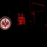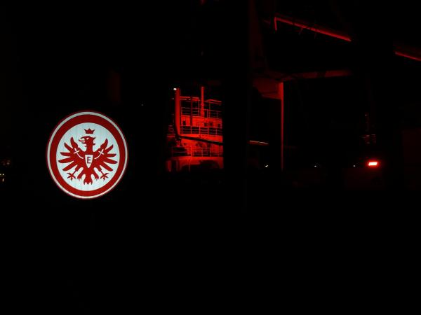 Kathrin und Henning sind auch schon vor Ort, bereiten die Kulisse für den Abend vor. Die Eintracht hat in und rund um Hamburg 700 Mitglieder, für sie ist der Abend gedacht. Einst wurden hier unter Deck die Fässer, Kisten oder Säcke geladen, die dann am anderen Ende der Welt landeten, jetzt leuchtet der Raum in den Farben der Frankfurter Eintracht. Vielleicht noch schöner die Beleuchtung draußen. Strahler leuchten das Schiff rot an, der Eintrachtadler auf Container und Schornstein projiziert, hurra, hurra, die Frankfurter sind da. Sogar unser Kumpel Ingo ist gekommen, dessen Herz ja für Werder Bremen schlägt.