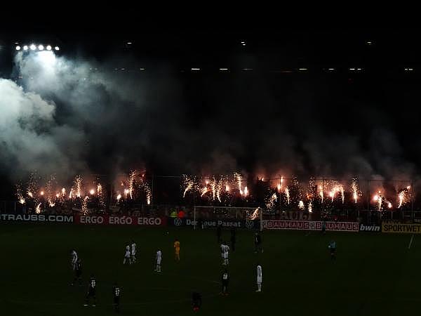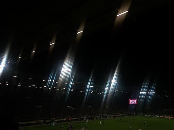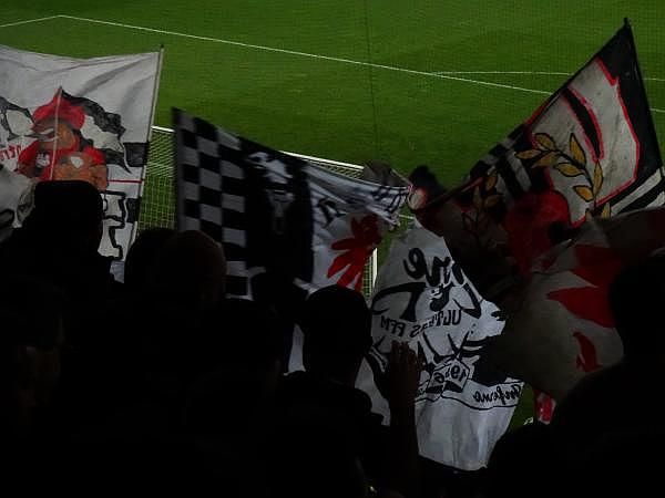 Am Einlass ist schon einiges los, die ersten Meter gehen flott – dann geht gar nichts mehr. Minute um Minute verrinnt, am Einlass passiert nichts. Drinnen hört es sich nach Feuerwerk an, wir stehen draußen. 10. 20. 30 Minuten, dann geht es weiter – ein kleiner Korridor, umsäumt von behelmter Polizei, lässt wenig Raum. Eine Karte will niemand sehen, kontrolliert wirst du auch nicht, es ist so albern wie sinnlos, wir sind drin, nehmen die Stufen hoch auf unsere Plätze, drehen uns um – und die Eintracht führt 1:0. Dost hatte in der ersten Minute getroffen. Na immerhin.