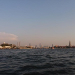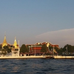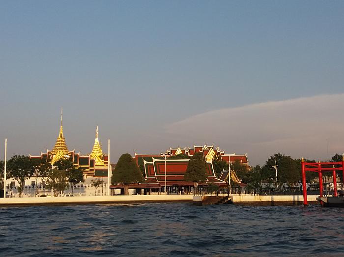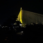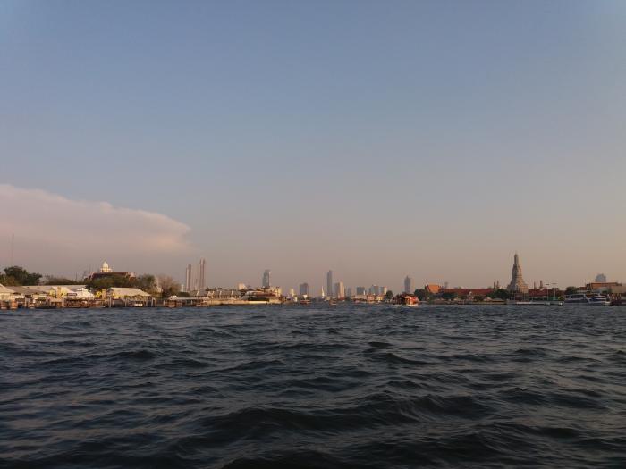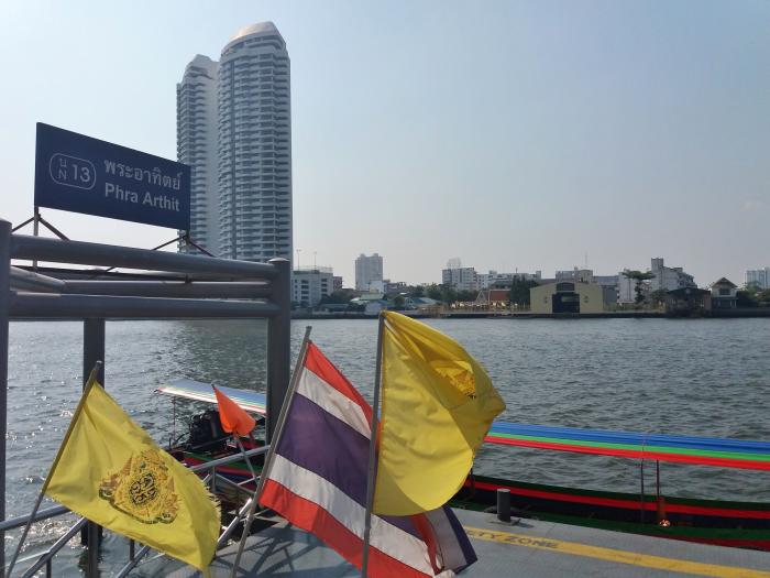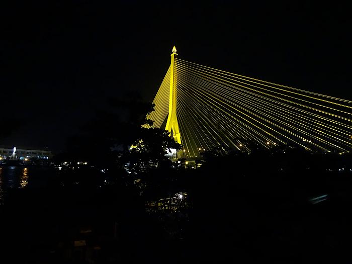 Wir ruhen uns aus, und machen uns dann zu Fuß auf eine kleine Tour durch die Stadt. Große Ziele haben wir nicht, die Tempel kennen wir, so treiben wir runter zum Fluss, und springen am Pier 13 auf ein Linienboot mit der orangenen Flagge, treiben vorbei am Wat Arun, vorbei am Königspalast und verlassen an einer der letzten Haltestellen das Boot, spazieren durch die kleine Markthalle nahe des Bahnhofes für die Skytrain, wandern durch das Viertel zwischen mächtigen Hochhäusern und handverlegten Stromkabelsträngen entlang. Hier und da wandert eine Kleinigkeit zu essen zu uns, Abends sitzen wir auf unserer kleinen Terrasse, trinken Chang Bier und blicken auf die golden beleuchteten Stahlstränge der Brücke Rama VIII. Boote tuckern ein paar Meter von uns entfernt vorüber, Wasserfahrzeuge jeglicher Art von kleinen Motorbooten bis hin zu den großen Partyschiffen, Musik schwappt an Land. Hallo Bangkok. Und während sich in Thailand die Nacht über uns legt, überschlagen sich in Deutschland die Ereignisse. Sollte am Morgen das Eintrachtspiel gegen Basel noch mit Publikum ausgetragen werden, so war am Abend klar, dass das Spiel unter Ausschluss der Öffentlichkeit stattfinden wird. Binnen kürzester Zeit werden Spiele und Veranstaltungen abgesagt, wird das öffentliche Leben in der Heimat lahm gelegt. Obwohl ich todmüde bin, kann ich nicht schlafen, blicke auf den Fluss, im Zimmer rauscht der Ventilator. Auch Pia ist jetzt wach. 9000 Kilometer weg von Zuhause.