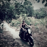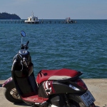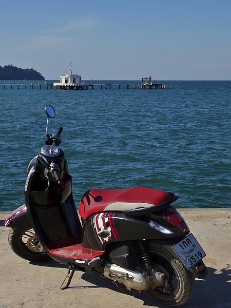 Die erste Rollerfahrt ohne Gepäck, die 125er Honda zieht gut, der Duft der Cashews, der Wind. Wir tuckern runter zur Kreuzung, fahren links durch den Dschungel Richtung Ostküste, vorbei an den Mönchen bis zum ganz alten Pier. Dort ist es immer ein großer Spaß wie einst Sting in Quadrophenia auf dem schmalen Steg Gas zu geben – volle Lotte aufs Wasser zu. Doch wir heben nicht ab. Wir bremsen brav und tuckern durche den Ort am Pier Richtung Long Beach, sind neugierig. Der kleine Laden mit den farbigen Souvenirs steht noch an Ort und Stelle. Bunte Kleidchen für die Damen, für die Herren dünne Hemden. Hier gibt es vieles, über Decken, Sarongs, Kokosöl, Aloe Vera, Taschen und Täschchen. Irgend etwas fällt immer ab. Wenn du weiter fährst, gerätst du derzeit in eine Baustelle, der Weg wird massiv verbreitert – es ist nicht ungefährlich hier durch die Strecke zu kommen. Noch ist der Boden sandig, das heißt Rutschgefahr, vor allem, wenn dir jemand entgegen kommt. Und wenn die Straße fertig ist, scheint sie mir zu groß für die Insel.