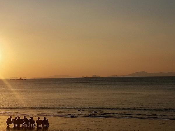 Noch stehen zwei Highlights an. Zum einen hat Kerstin bald Geburtstag, zum anderen der letzte gemeinsame Abend. Für diesen bestellen wir ein Massaman vor. Dann fahren wir zur Eaglebar in der Nähe der Moken, eine Gruppe, die am Rande der Insel lebt und unter sich bleibt. Der Weg durch den Dschungel ist staubig. Wir trinken einen Cocktail und blicke auf unsere Bucht von der anderen Seite. Als wir zurückkehren, ist die Sonne untergegangen. Zwei Tage später laufen wir am Strand für den Sonnenuntergang zur Hippie Bar. Hunde begleiten uns ein paar Meter. Die Weingläser der Frauen glänzen gelb in die untergehende Sonne, die Gesichter im Schatten, Momente für die Ewigkeit.