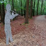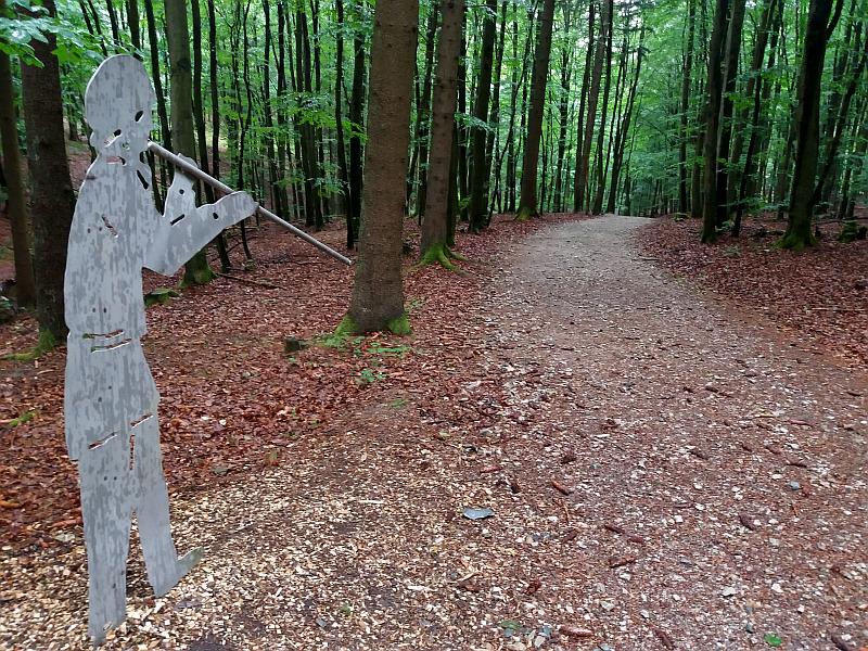 Und ich hätte es mir denken können: Wenn du oben parkst und nicht auf den Großen Feldberg willst, dann geht es bergab, was nichts anderes heißt, dass es am Ende bergauf gehen wird. Und zwar heftig. Der Schotterweg fällt wirklich rasant ab, schon nach wenigen Metern auf dem Schinderhannessteig verkündet ein Schild, dass es nur einige hundert Meter bis zur alten Glasbläserhütte sind – und tatsächlich weist bald ein metallener Glasbläser am Wegesrand auf die Abzweigung Richtung Emsbachschlucht, es sind nur ein paar Schritte bis zu den steinernen Überresten der alten Öfen mitten im Wald. Glasbläser hielt es seinerzeit nie ewig an einem Ort. Neben Wasser waren Buchen wesentlich für ihre schweißtreibende Arbeit, waren die umliegenden Bäume gefällt und verbrannt, zogen sie weiter an einen nächsten Ort.