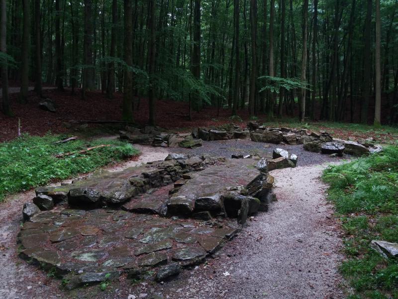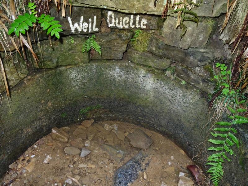 Hier ein Päuschen, da ein Päuschen und letztlich lande ich doch wieder am Parkplatz. Da ich noch keinen allzu großen Hunger habe, gleichwohl aber in der Gaststätte einkehren möchte, drehe ich noch ein Runde um das Feldbergkastell und lande an der Weilquelle. Die alten Römer, clever wie sie waren, hatten ihr Kastell nicht an der alten Straße erbaut, nein, sie nutzten die Nähe der Quelle – und konnten somit auch ein Bad betreiben – sogar mit warmen Wasser. Ob das die Glasbläser gewusst haben?