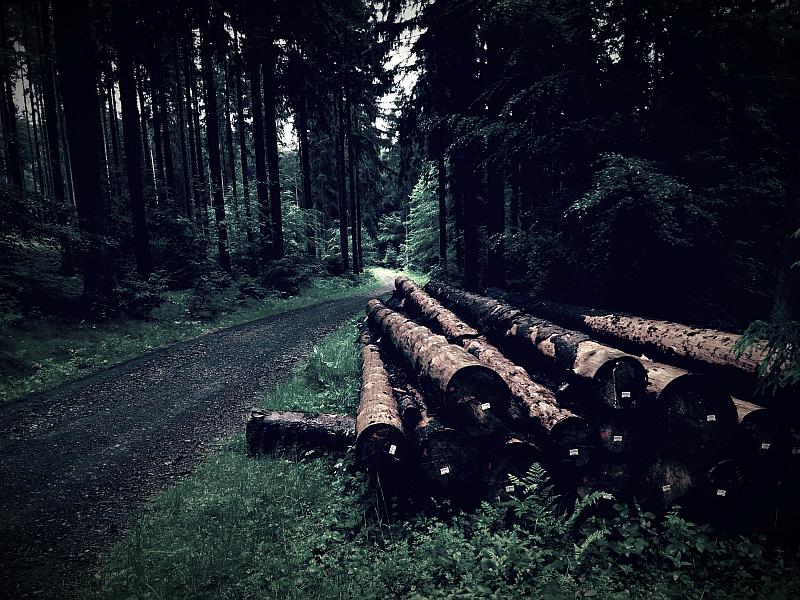 Auch ich ziehe weiter, denke an diejenigen, die hier einst geschuftet haben. Das ist das Schöne am Wandern, die Gedanken drehen frei, inspiriert durch Geschichten und Gerüche, durch Blicke und Baumwald. Vorbei an der Gottschalk-Fichte laufe ich Richtung Oberems, zwei Frauen kommen mir entgegen, grüßen brav, derweil ich zurück grüße und bis zum Ort runter auf niemanden mehr treffe. Die Regenjacke reicht aus, obgleich es durchweg tröpfelt. Ich passiere den Sportplatz in Oberems. Am Wegesrand mäht ein Unimog mit Seitenmäher den Hang, sein tackern verfolgt mich in der Stille.