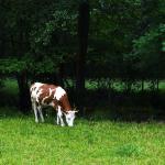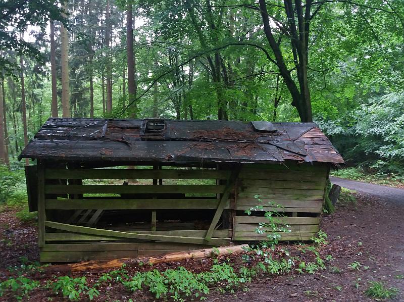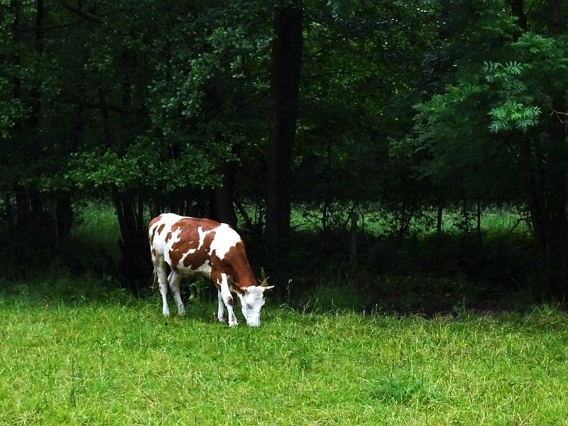 Ein paar Metern hinter den ersten Häusern zweigt ein Weg rechter Hand in den Wald ab – und so marschiere ich auf der anderen Seite des Naturschutzgebietes rund um den Emsbach nach oben. Bin ich bislang nur bergab gewandert, so verkehrt sich dies nun ins Gegenteil, es geht schnurstracks in die Höhe. Hoffentlich führt mich der Weg auch zurück und knickt nicht irgendwo in eine völlig andere Richtung ab. Grob hatte ich mir, bevor es losging, einen Überblick verschafft, aber man weiß ja nie. Ob des Regens habe ich auch keine Lust, die Karte raus zu holen. Auf der Wiese nebenan grasen gelangweilt zwei Kühe, während ich mich nach oben schiebe und doch auf dem richtigen Weg bin. An einer zerfallenen Hütte raste ich kurz und bald lande ich wieder bei den Glasbläsern. Der letzte Kilometer zur Straße hin ist anstrengend, ich hatte es geahnt, für große Steigungen bin ich nicht gebaut, da geht es mir wie dem Dacia.