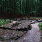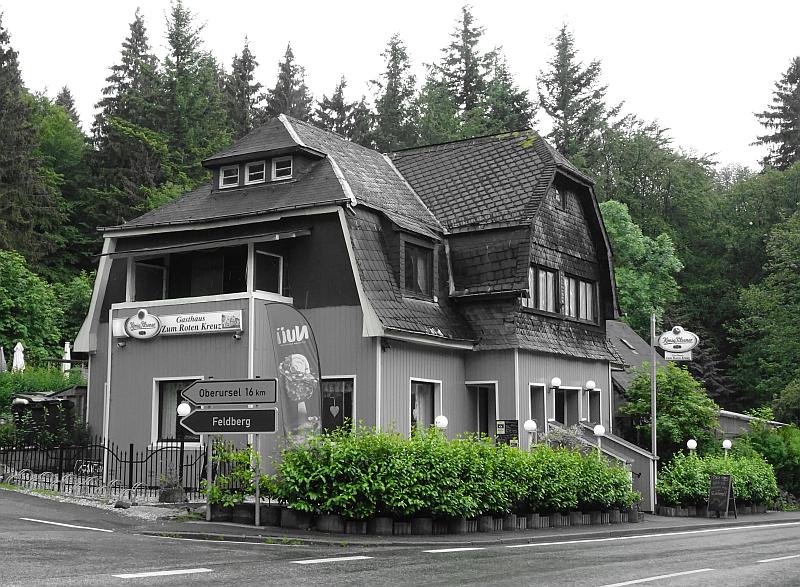 Früher hieß „Taunus“ ja meist: Großer Feldberg. Am kleinen Kiosk gab es für einen schmalen Taler einen Becher heiße Boullion, 2016 sollte dieses wunderbare Relikt aus vergangenen Zeiten schließen, durfte nach Druck aber doch noch etwas länger betrieben werden. Heute dürfte er endgültig dicht sein, der Kiosk, wahrscheinlich folgt irgendwas mit „Event-Gastronomie“, ich weiß es nicht, ich war nicht oben. Als ich den Dacia gegenüber dem Gasthaus „Zum Roten Kreuz“ parke, nieselt es noch immer. Mein erstes Ziel sind die Reste einer alten Glasbläserei in der Emsbachschlucht. Große Pläne jedoch habe ich nicht, wenn es schütten sollte, wäre ein kurzer Weg zum Auto vorteilhaft. Bepackt mit einer dünnen Regenjacke und einer Wasserflasche sowie einer Wanderkarte marschiere ich los.