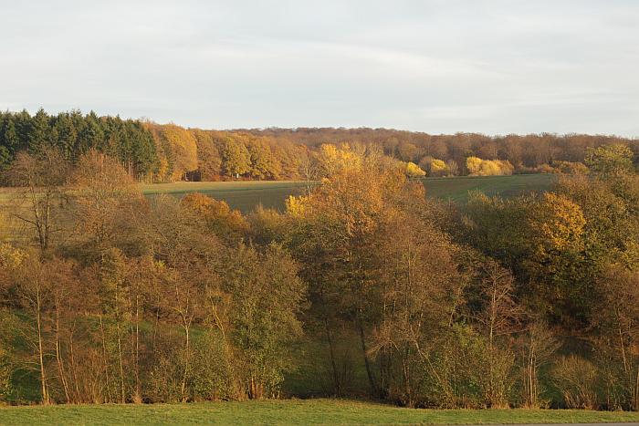 Vom Parkplatz an der Schule geht es hoch an den Waldrand, vorbei an ein paar einsamen Häusern, unten quert eine Bahntrasse. Ein letzter Blick ins Tal, dann geht es in den Wald. Hie und da grüßt ein Spaziergänger, ansonsten ist es ruhig. Die ersten Meter führen ordentlich nach oben, für den Mantel ist’s zu warm, die Fototasche eigentlich zu schwer. Zumal das Licht nicht schön zum fotografieren ist. Wir passieren die Meineidsbuche im Wald, ein Gedicht erinnert an einen mächtigen Hirsch, der nach langem hin und her erst verfolgt, dann erlegt – und dann gestohlen wurde. Der Wald zeigt sich düster herbstlich, noch hängen gelbe Blätter an den Bäumen. Je weiter es nach oben geht zeigen sich lichte Stellen, ob ein Sturm dafür verantwortlich war? Außer dem ein oder anderen Mountainbiker begegnen wir keiner Menschenseele und da der Weg gut beschrieben ist, finden wir uns problemlos zurecht. Zumal Wegweiser immer wieder auf die Ortschaften der Umgebung verweisen. So sie die Dorfjugend nicht verstellt hat.