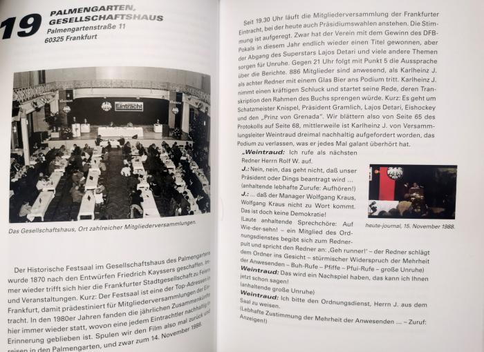 Und genau da haben wir angesetzt. Schnell kamen wir auf die Zahl 59. Jeder Eintrachtler weiß, das die SGE 1959 Deutscher Meister wurde, damals in Berlin gegen die Kickers. So war die Idee geboren, unsere literarische Stadtführung auf den Spuren der Eintracht durch 59 Orte streifen zu lassen, deren Eintracht-Hintergrund wir in kleinen Geschichten zusammenfassen und durch Fotos bebildern. Natürlich hätten es noch viel mehr Orte sein können – aber einerseits drängte die Zeit, da wir das Büchlein auf dem Gabentisch zu Weihnachten präsentieren wollten, andererseits sollte es ja auch noch tragbar sein, für die eigenen Erkundungen bei schönem Wetter.