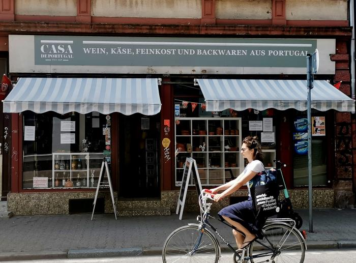 Und wenn wir schon einen gechillten Urlaubstag in Sachsenhausen begonnen haben, dann lassen wir uns den Urlaub auch nicht mehr nehmen. Nach einer ganzen Weile im Viertel wander ich rüber in die Brückenstraße, der aufgehübschten, schönen aber auch verwöhnten Schwester von Alt-Sachs. Vorbei am Drauf und dran, Astrids Tattoo-Studio, geht’s jetzt nach Portugal. Im Casa de Portugal gönne ich mir einen Galao, ein Pasteis de Nata und ein Rissois de Camarao, während für Pia auch noch ein Pasteis abfällt. So schlendere gedanklich durchs Alentejo, sitze am Cabo de Sao Vincente am Meer und trinke am Tejo einen Vinho Verde. Mit meinen Köstlichkeiten in der Hand laufe ich rüber in den Park an der Schifferstraße, setze mich auf einen Baumstamm. Leben wie Gott an der Algarve. Hinter mir untermalt ein Gitarrist mit seinen Klängen sehr behutsam die Szenerie, es fehlt nicht viel und jemand beginnt zu singen. Fado. Kleine Glücksmomente.