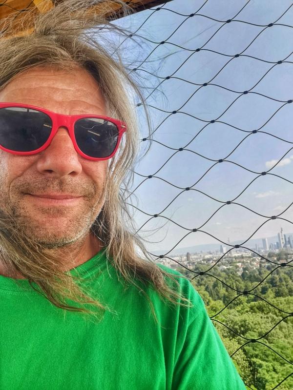 Nach ein paar Metern wächst er vor mir in die Höhe, der Goetheturm – Frankfurts schönstes Hochgebäude. Unten auf einem Bänkchen sitzt Lisa mit einem Kumpel, wir babbeln eine Weile, dann lasse ich die beiden in Ruhe und schleppe mich die Stufen nach oben. „Acht Menschen gleichzeitig“ weist ein Schild aus. Aber wie soll das gehen? Nach oben steigen, abzählen, feststellen, dass wir mehr als acht sind und dann wieder runterklettern. Egal, ich bin geimpft. Hier und da kommt mir jemand entgegen. Ich halte gebührend Abstand, bin gar nicht so böse über die kleinen Päuschen – und habe es nach roundabout 200 Stufen geschafft. Vor mir liegt Frankfurts Skyline, davor das grüne Blätterdach des Stadtwaldes, dahinter wächst der Taunus in die Höhe. Frankfurt. Bankfurt. Oder wie die Straßenjungs einst sangen: „Bankfurt, Bankfort, ich wollt es wär hier jede Bank fort“. Heimat. Moloch. Nischen. Jede Straße mit dem Taxi durchfahren, überall lagern Geschichten, Tragödien, Komödien und hinten im Wald, da spielt die Eintracht. Der Blick gleitet in die Ferne. Doch. Hier ist mein Zuhause. Kindergruppen kommen vorbei, suchen Euros, um durchs Fernrohr zu gucken. Aufgeregtes Geschnatter. Wer weiß, vielleicht denken sie irgendwann einmal an den Tag zurück, an dem sie erstmals hier oben waren. An mich wird sich niemand von ihnen erinnern, soviel ist sicher. Und hoffentlich kommt kein Kleinhirn auf die Idee, den Goetheturm wieder anzuzünden. Denn zum Urlaub in Frankfurt gehört ab jetzt der Besuch des Goetheturms.