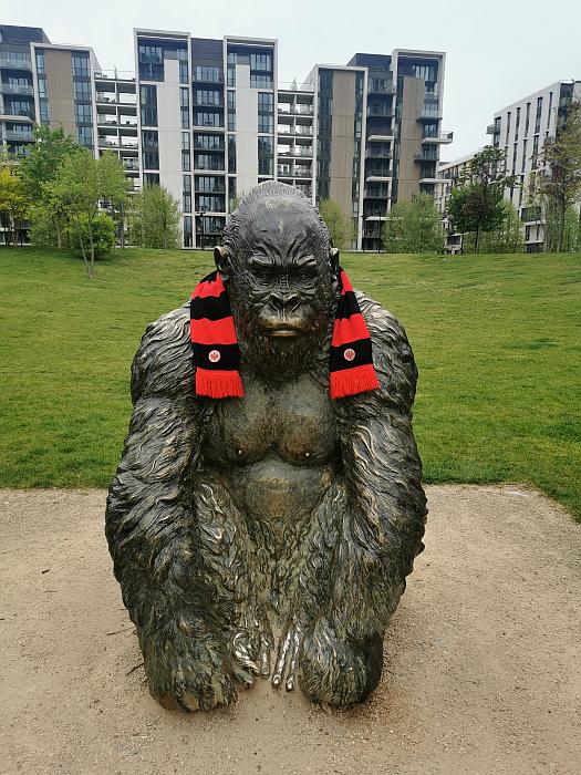 Basti und die Jungs hielten sich kurz in einem piekfeinen Hotel auf, wir marschierten über lärmdämpfende Teppiche, überall vornehmes Menschengewisper, ich in der Auswärtsmood mit einer Dose Bier in der Hand. Sie saßen draußen auf der Terrasse bei Schwarztee (Bitte nicht rauchen) und hatten Ticketfragen zu klären. Ein netter Hotelangestellter kam auf mich zu, bat mich in ausgesucht unaufgeregter Freundlichkeit darum, mein Bier in ein von ihm gebrachtes Glas zu gießen und nahm meine leere Dose mit. Kurz war ich versucht, nach einem Aschenbecher zu fragen, wollte die Gastfreundschaft aber nicht überstrapazieren. Quatschte mit Marvin und Kristian, dann wanderten wir zurück auf die Straße, vorbei an einer mit West Ham Trikot verzierten winzigen Bullldogge, Menschenmengen auf feinen Plätzen – im Hintergrund wuchs das Olympic Stadium in die Höhe, heute die Heimstätte von West Ham. Nach einem kurzen Abstecher zu den Bussen ging‘s Richtung Gästeeingang. Unterwegs natürlich ein großes Hallo auf allen Wegen. Das beste war, dass wir auf dem Weg Joe trafen. Joe ist ein Junge aus England, der Bundesligastadien aus Lego nachbaut, natürlich auch unser Waldstadion. Vor ein paar Wochen hatte ich ihm jede Menge Detailbilder geschickt, da war von einem Spiel der Eintracht in London noch keine Rede. Jetzt posierten wir für ein Selfie, High Five. Cool. Und für Lea fiel auch noch ein Ticket ab. VIP. Erst war die Freude groß. Dann schlüpfte sie hinein. Und flog wegen des deutschen Passes wieder raus. Am End war sie dann doch drin. Alles gut!