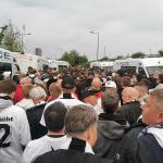 Das Anlegen dauerte ein Weilchen, dann kletterten wir alle wieder in den Bus und rollten im Linksverkehr durch England, passierten Folkstone und Canterbury, bis wir London erreichten, uns durch manchen Stau quälten, bei der O2 Arena seltsame Gebäude entdeckten und letztlich am Gästeparkplatz den Bus parken konnten. Da war es. Das Olympiastadion. Hammer. 11 Uhr. Ich war jetzt seit 29 Stunden wach – und hatte einen langen Tag vor mir, gipfelnd im Spiel der Eintracht. Peu a peu trudelten auch die Busse ein, die die Tagesflieger von Stansted zum Stadion brachten, hier war Nina, da Grischa – ein großes Hallo hub an – und zu meiner Überraschung traf ich auch Kid, dessen Reise sich eigentlich schon zerschlagen hatte.