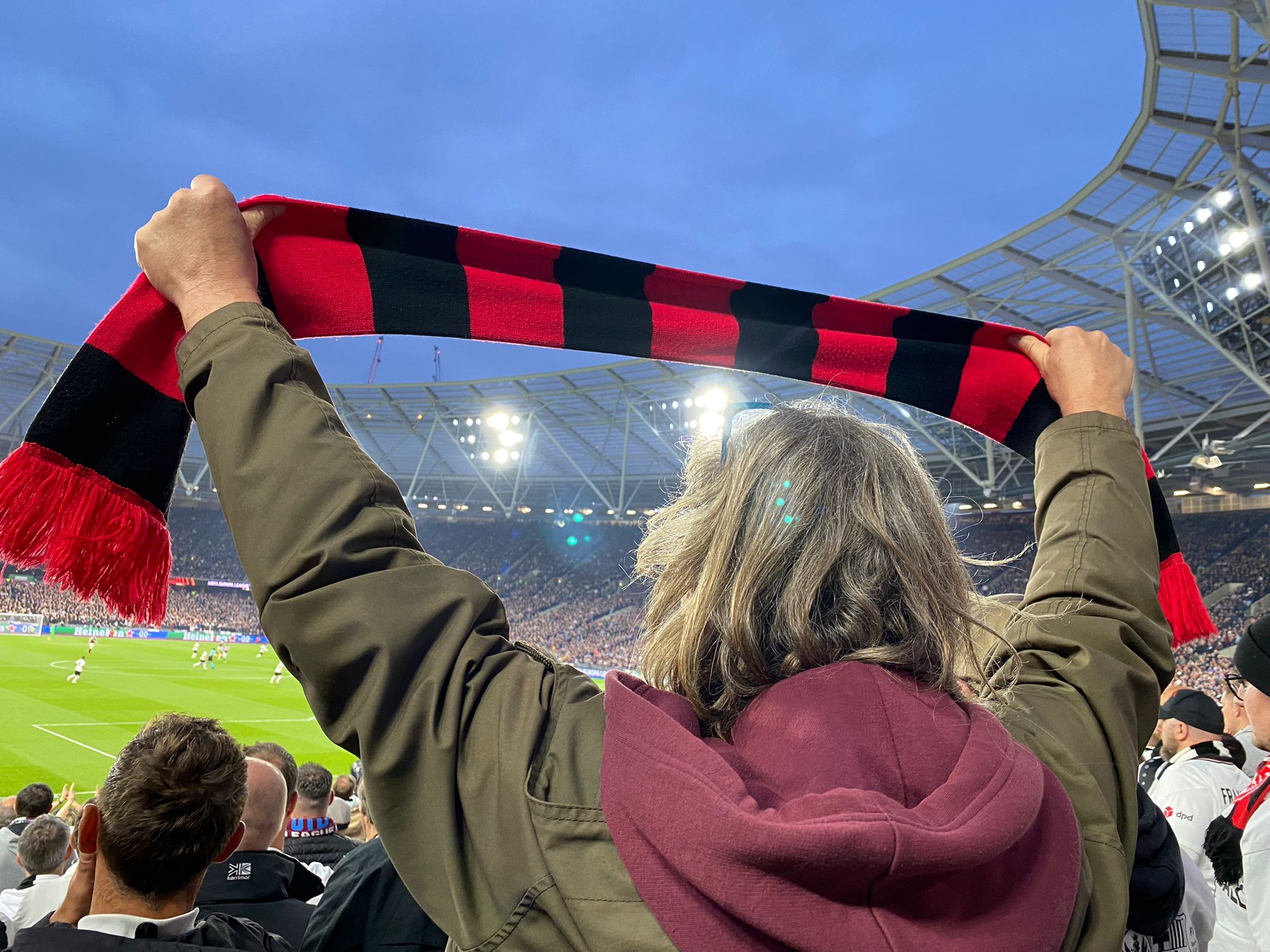 Naja, wir sangen unsere Lieder, auf der Gegentribüne kleine Choreo, langsam wurde es Fußball. Wir schwenkten unsere Fähnchen. Anpfiff. Tor für die Eintracht. Was ist denn hier los? Die Engländer guckten blöd, wir fielen übereinander. Knauff. Der Wahnsinn erreichte eine neue Ebene. Es entwickelte sich ein munteres Spielchen ohne Mätzchen, die Zeit ging schnell vorbei. Oh Eintracht Frankfurt Schalalalala … Batsch. Ausgleich. Immerhin war auch in London die Inszenierung vorbei, jetzt wurde es insgesamt merklich fußballerischer, die Hammers sangen ihre Lieder, bei uns leuchtete ab und an ein Fackelchen, der Stadionsprecher hielt sich zurück, eine Fankurve in unserem Sinne gab es bei West Ham nicht. Von oben wurden wir vereinzelt bepöbelt, grüßten zurück. Halbzeit.