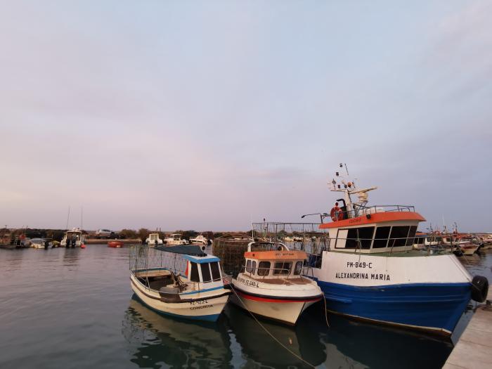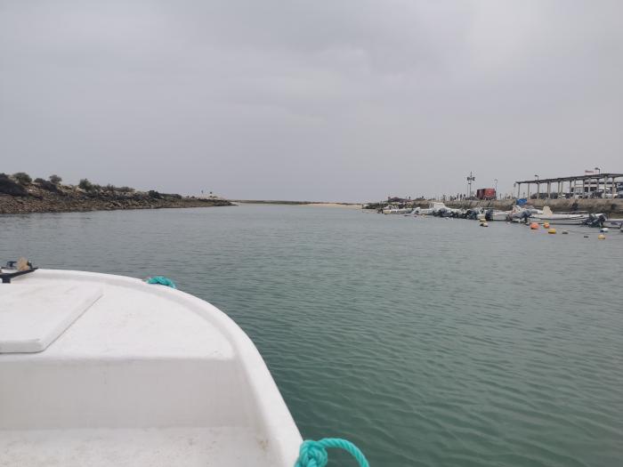 Unser Boot sollte um halb drei ablegen, kurz vor der Zeit spazierten wir am Kanal entlang. Wir waren nicht die einzigen, die an diesem Nachmittag auf die Idee gekommen sind, diese Tour zu unternehmen. Die ersten Mitreisenden gingen an Bord und setzten sich alle auf eine Seite, worauf der Kahn leicht zu kippen drohte. Also balancierten wir das Boot gemeinsam aus. 14 Touristen und Isabell, unsere Kapitänin dazu. Als wir schon ablegen wollten, stiegen noch zwei Nachzügler zu, wir legten die Schwimmwesten an und tuckerten mit leisem Motor los. Wir saßen ganz vorne und schoben uns den Kanal entlang, vorbei an den zwei Leuchttürmchen und passierten gemächlich den Strand Richtung der Ilha de Armona. Möwen begleiteten uns, als wir die eher unscheinbaren Austerfarmen erreichten. Isabell erklärte uns, dass die Austern hier in weitaus kürzerer Zeit als in Frankreich zur Verkaufsgröße heran wuchsen. So werden sie zur rechten Zeit in Richtung Arcachon transportiert, um dort einige Wochen nachzureifen, um anschließend als französische Austern auf den Märkten der Welt zu landen. Oystercrusher, Vögel mit spitzen Schnäbeln, beäugten uns und spekulierten auf ein kostenloses Abendessen. Zu Pias Leidwesen entpuppte sich der erhoffte Flamingo als Kormoran.