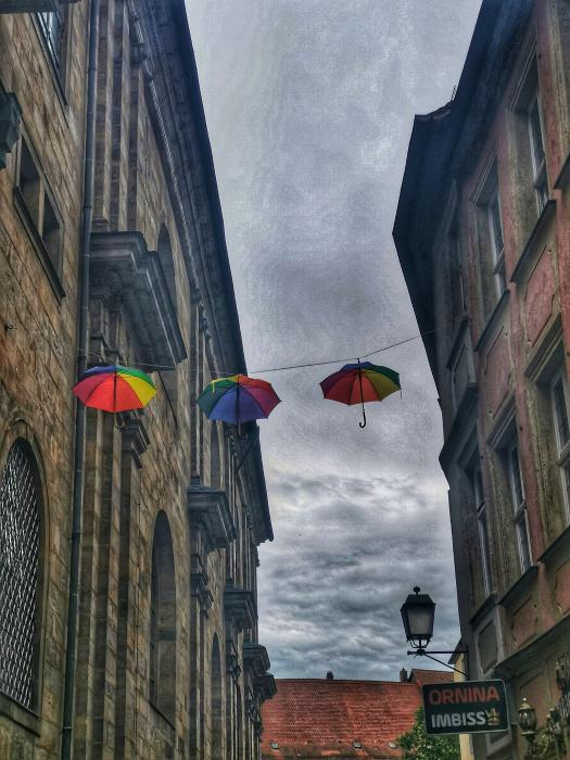Wir treiben durch die weitgehend von Kriegsschäden verschont gebliebene Stadt, essen Bratwürste, trinken Schlenkerla und blicken von der Brücke am alten Rathaus auf den Arm der Regnitz. Weiter hinten liegt Klein-Venedig. In Frankfurt regnet es, hier scheint die Sonne. Die Aufführungen von Romeo & Julia werden erst in ein paar Wochen in der Alten Hofhaltung über die Bühne gehen, von daher wandern wir über ein Brückenlabyrinth an die Stelle an der Regnitz, von wo eine Seilfähre in den Sommermonaten Passagiere ans andere Ufer bringt und beobachten das rege Treiben. Alsbald ruft die Rückfahrt. Zuvor gönnen wir uns noch ein Eis (Waldmeister) und spazieren gemütlich zum Bahnhof. Schon vor der Zeit wartet die Bahn am Gleis, wir setzen uns wieder an einen Vierer-Tisch. Pia packt ihr Buch aus, ich stöpsel mir die Kopfhörer in die Ohren und schon rauschen wir los. Leichter Sommerregen klopft ans Fenster. Kurz vor Schweinfurt nicke ich ein und bemerke gar nicht, dass wir in Würzburg nicht anhalten. Im Regionalexpress ist noch massig Platz, die Fahrt ist unspektakulär, sieht man einmal davon ab, dass das Grün des Spessart zu Wanderungen einlädt. Später rollen wir an Oberrad vorbei, meiner alten Heimat – und rattern mit der 18 vom Südbahnhof ins Nordend. In der Bahn erkennen wir den jungen Mann wieder, der sich gestern mit seiner Freundin gestritten hatte, diesmal steigen beide gemeinsam aus. Geht doch. Als wir die Haustüre aufschließen, fühlen wir uns, wie nach einem Urlaubstag. Unterwegssein. Erleben.