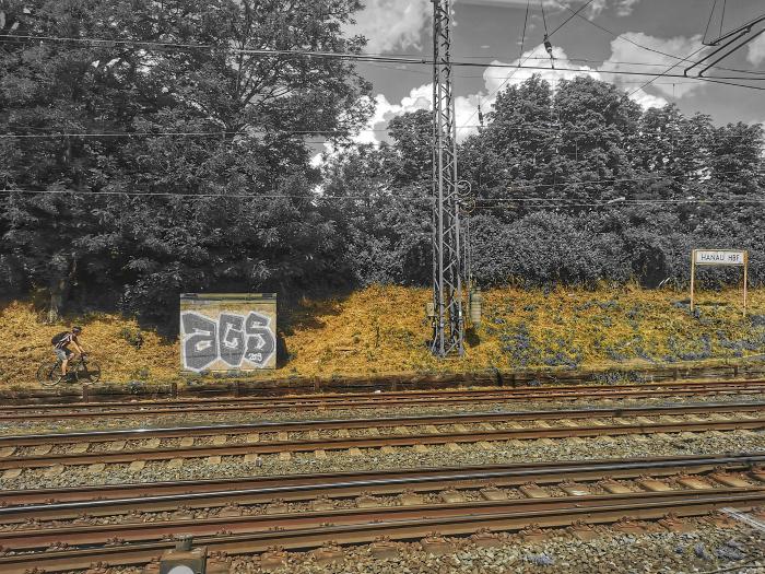 Da das Ganze recht gut geklappt hat, beschließen wir, auch am Samstag die Bahn Richtung Aschaffenburg zu nehmen, ein Familienfest steht an. Wieder rasselt die 18 in Richtung Südbahnhof, vorbei am Haus mit der Friedenstaube auf der Wandrückseite, vorbei am kleinen Thai in der Dreieichstraße. Knapp bekleidete junge Menschen sitzen mit uns in der Straßenbahn, unverkennbar wird sie der Weg ins Stadion führen. Dort spielt heute jedoch nicht die Eintracht, vielmehr wird das Gelände mit elektronischer Musik beschallt. Die ersten Klänge tönen durch die Bahn. Wir lassen am Südbahnhof die Techno-Jünger hinter uns und spazieren zu den Gleisen. Die Regionalbahn ist fast pünktlich, wir sitzen und ich schaue rücklings aus dem Fenster. Das finale Ziel ist Bamberg – dort waren wir vor ziemlich genau 10 Jahren einmal, auf dem Rückweg aus der fränkischen Schweiz. Soweit geht es heute nicht. Über Hanau erreichen wir den Aschaffenburger Hauptbahnhof. Zwanzig Minuten später sitzen wir im Bus nach Nilkheim und fünf Minuten danach in einem Garten und trinken Apfelwein. Zurück geht es mit meinen Eltern im Auto bis nach Dietzenbach. Dort warten wir auf die S-Bahn, die mit zwei-minütiger Verspätung anrauscht. Als wir einsteigen, fällt auf, dass Masken hier nicht unbedingt ein Must Have sind. Hinter uns telefoniert jemand, die nackten Füße auf dem Sitz. Offenbach. Konsti. 18. Ein junger Mann hat Ärger mit seiner Freundin, wir können das Gespräch hautnah verfolgen, geben aber keine Verhaltenstipps. Muss er selbst sehen, wie er mit ihr klar kommt.