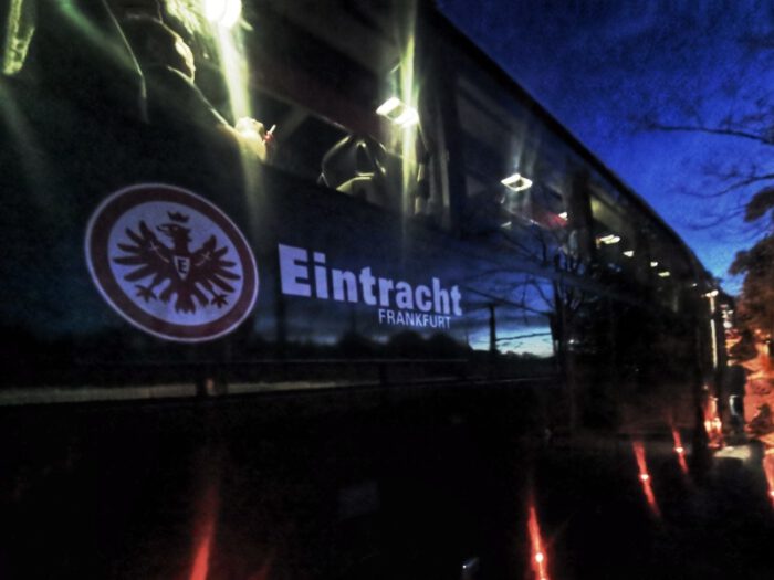 Als ich am Fernbusbahnhof eintrudelte war ich gut in der Zeit, ein paar Mitreisende warteten im Dunkel, auch Janine von der Fanabteilung, unsere Reiseleitung, war schon vor Ort. Die Busse, es sollten zwei sein, allerdings noch nicht – aber uns blieb bis zur geplanten Abfahrt noch jede Menge Zeit. Peu à peu trafen die Mitfahrer ein, erstaunlicherweise kannte ich außer Steffen niemanden, aber das war nicht tragisch. Ich wunderte mich nur, dass ich viele Eintracht-Klamotten sah und dachte bei mir: Leute, nehmt die Sache ernst. Aber bis zum Mittelmeer war es noch weit. Als die großen schwarzen Setra-Busse gegen acht Uhr eintrudelten, prangte an den Außenwänden der Eintracht-Adler – und ich erstaunte noch mehr. Wir wollen doch nicht mit dem Adler in Marseille einrollen? Genauso gut hättest du auch eine Zielscheibe aufkleben können. Aber lassen wir die Dinge sich erst einmal entwickeln.