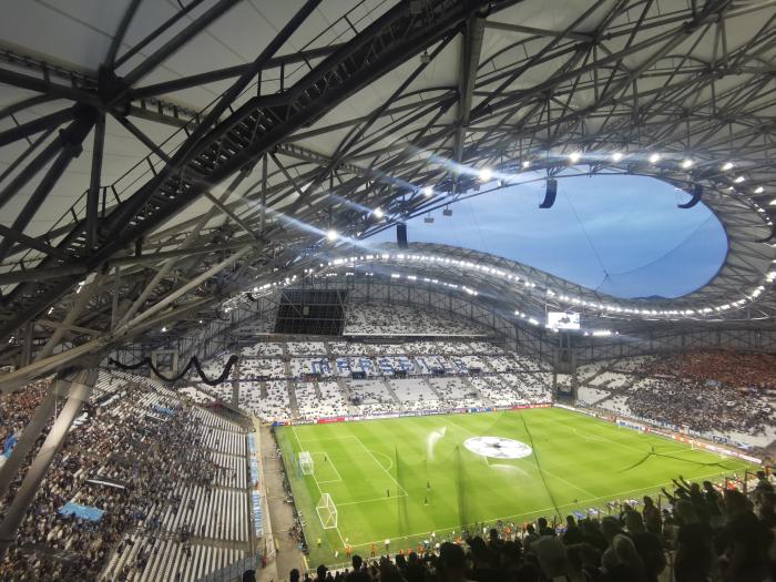 Ich breite mit Blick auf den Rasen beide Arme aus und atme einmal tief ein und aus. Der Blick ins Velodrome ist phantastisch, das geschwungene Dach, die gewagten Rohrkonstruktionen der Träger. Die Höhe. Die gefüllten Tribünen. Genau dafür hat sich die Reise gelohnt, diesen Blick wollte ich haben. In der Kurve der Marseillaner neben uns explodiert ein Böller. Wechselgesänge. O-lym-pique, O-lym-pique. Klingt wie: Auswärtssieg! Wieder ein Böller.