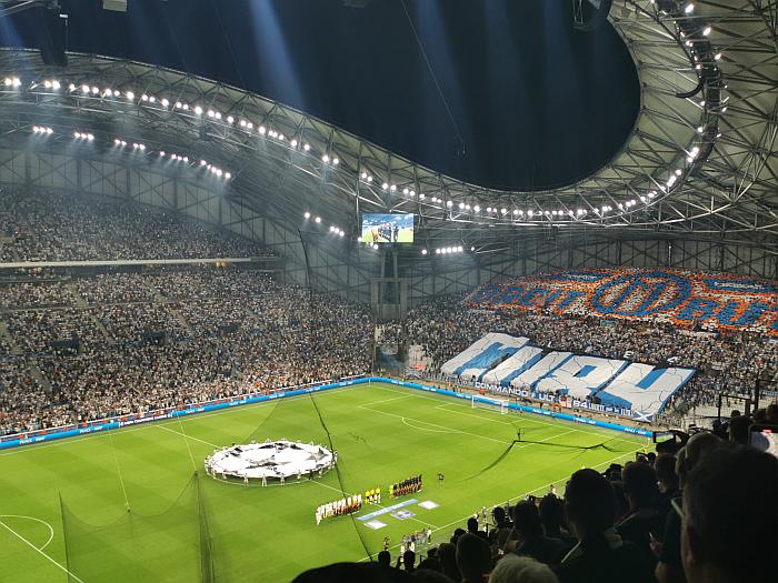 Alles was anschließend passiert, kann ich heute nicht mehr zeitlich genau einordnen, ich habe es angesichts dessen, was dann geschieht wohl im Detail verdrängt – auch weil mein Blick immer wieder auf den Teil der Heimkurve fällt, die links neben uns den unterschiedlichsten Aktivitäten zugetan ist. Der Typ mit der Flagge Palästinas. Die Mittelfinger. Die, die plötzlich aus dem Stadion treiben. Ich sehe unsere Torhüter, die mit Pfiffen seitens der Olympique-Fans empfangen werden. Das Warmmachen der Mannschaften. Marvin und Heike finden ihre Plätze neben mir, Malisa kommt kurz hoch. Böller explodieren. Groß, die Champions-League-Hymne erstmals im fremden Stadion zu erleben zu dürfen. Marseille zieht eine Choreo auf. Anpfiff, wir supporten, die Eintracht mit Hasebe in der Startelf. Zwischendrin fliegt Feuerwerk auf beiden Seiten hin und her, die erste Rakete landet im Marseilleblock. Böller nur auf Seiten der Franzosen, aber nicht geworfen. Eine Reihe behelmter Polizisten steht am Rand des Zauns auf unserer Seite, wir sind immerhin außerhalb der Reichweite der Pyrotechnik – so wird es die folgenden 96 Minuten gehen.