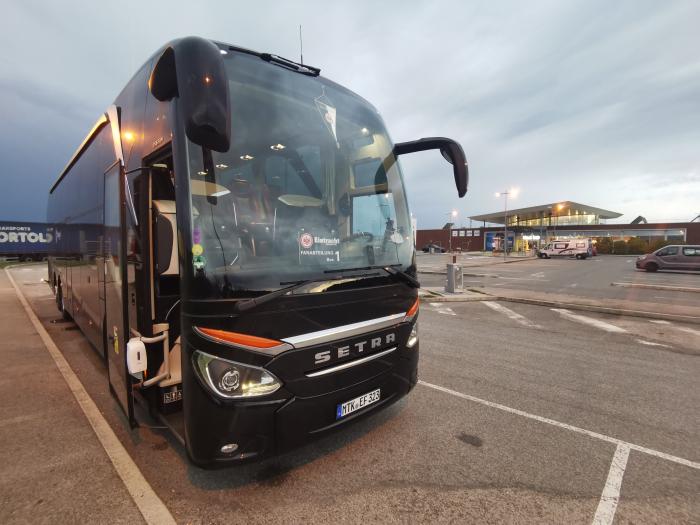 Wir checkten ein, bekamen die Tickets in die Hand gedrückt und ich hockte mich gleich in die zweite Reihe ans Fenster, gespannt, wer mein Sitznachbar werden sollte. Wie sich später heraus stellte, war der Bus nicht ausgebucht, der Sitz neben mir blieb zunächst frei – aber wir hatten ja noch einen Stopp an der Wintersporthalle. Mit einiger Verspätung setzten wir uns in Bewegung und rollten ans dunkle Stadion. Ich rauchte eine letzte Zigarette während finale Details geklärt wurden, dann enterten wir die Autobahn. Der Platz neben mir blieb immer noch leer – und darob war ich auch nicht böse.