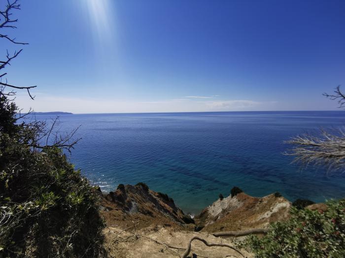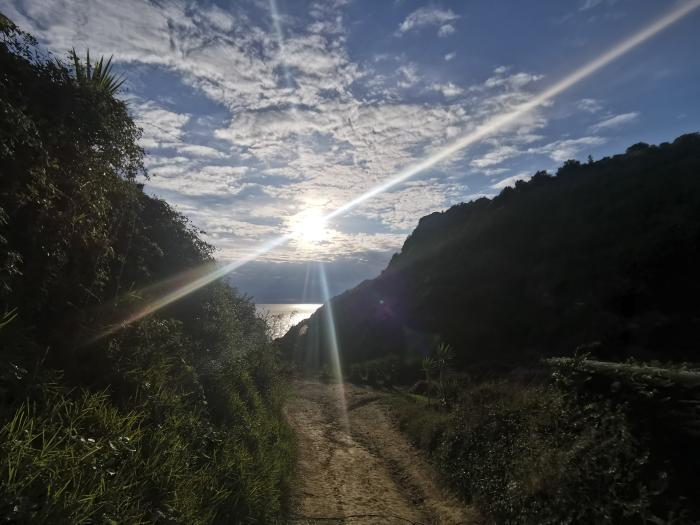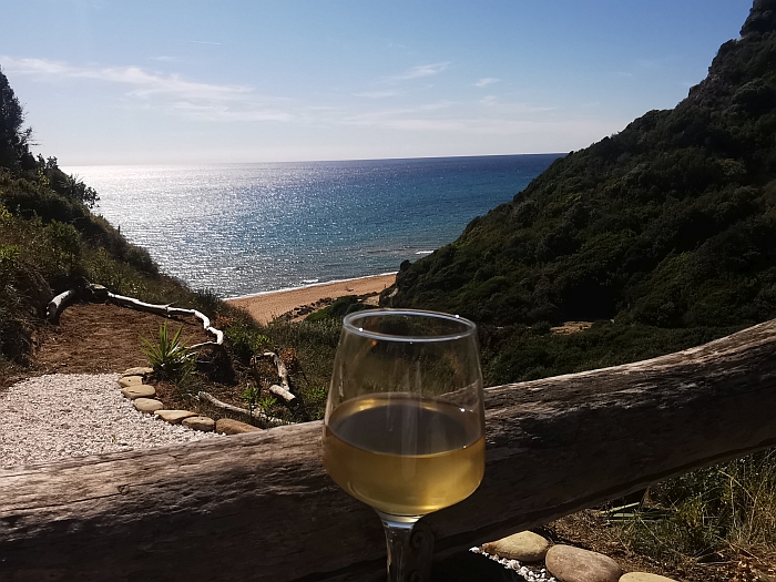 Friedlich und warm der Empfang, die Sonne lachte über uns, brannte aber nicht den Pelz weg. Wir warfen den Micra an und fuhren los, bogen nach ein paar Metern links ab und holperten durch einen Olivenhain an kleinen Appartementhäuschen vorbei Richtung Strand. Die Sonne zeigte auf frühen Nachmittag, das Ionische Meer wellte sacht vor sich hin. Wir parkten den Micra an der letzten Ausbuchtung vor den sandigen Felsen, und spazierten mit den Füßen im Wasser durch die anrollenden Wellchen bis hinter zum Secret Paradise Beach. Drei Sonnenschirmchen steckten im Sand und spendeten Schatten, der ob der wehenden Brise nicht von Nöten war. Wir breiteten unsere Sarongs aus, beschwerten sie an den Ecken mit flachen Steinen. Alsbald trieb ich im Meer und blickte auf die steil nach oben ragende Küste. Kaum zu glauben, dass ich keine 24 Stunden zuvor fast an der Mietwagenbuchung verzweifelt war. Später glänzte ein kühles Glas Weißwein in die Sonne. Wir saßen in der kleinen Bar, zu der ein sandiger Weg versetzt mit Steinchen nach oben führte, das Geländer aus Treibholz gefertigt und schauten aufs weite Meer.