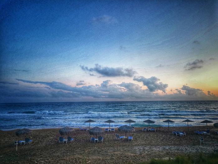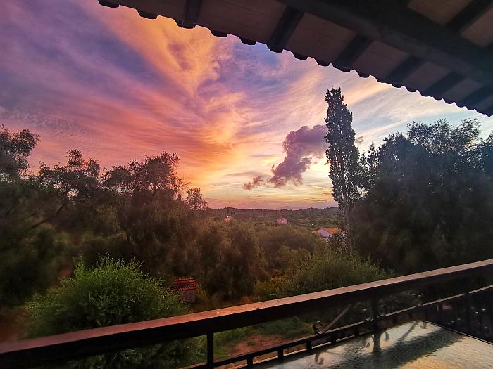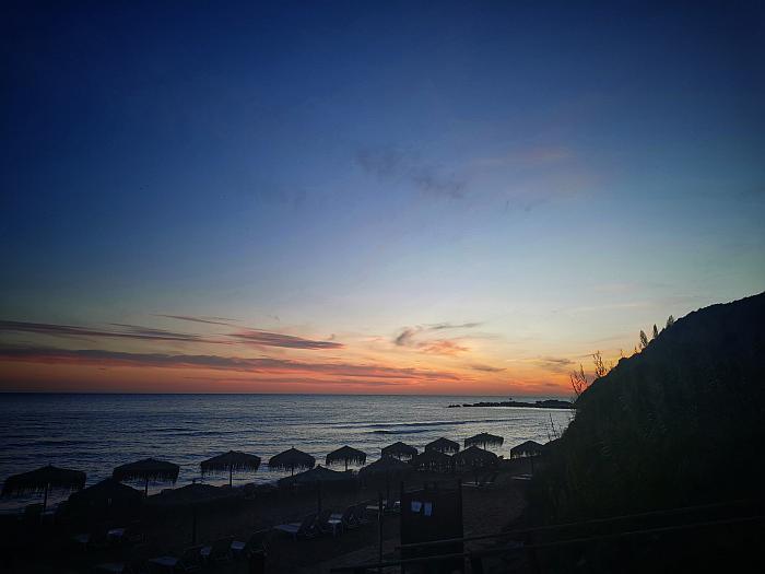 Tagsüber rollten wir mit dem Micra durch den Süden Korfus, stellten die Kiste irgendwo ab und spazierten durch Lefkimmi nahe der Küste oder nach Chlomos oben in den Bergen, tranken Kaffee und blickten aufs Meer. Falls ihr mal in der Nähe seid: Lasst Kavos links liegen, der einzige Ort, der an einen Rummelplatz mit Disco und Quadverleih erinnert. Seht lieber zu, dass ihr einen leicht schweißtreibenden Spaziergang zur verfallenen Klosterruine Panagia macht und euch dann zum Strand Arkoudilas durchschlagt. Abends saßen wir meist bei Moussaka und Souvlaki in der Taverne Julia mit zauberhaftem Blick auf das Lichtspiel des Sonnenuntergangs und beendeten die Tage auf dem Balkon, untermalt von Ana Moura, Black Swan Lane , Cesaria Evora oder The War On Drugs. Noch in der ersten Woche spazierten wir am recht einsamen Strand entlang als es plötzlich „Beve“ rief. Ich drehte mich um – und traf auf Manuel, den ich seit 20 Jahren lose von der Eintracht her kannte. Er war auch in Marseille und urlaubte hier mit seiner Frau Julia, die mir auch nicht gänzlich unbekannt war, immerhin sind wir für den gleichen Verein tätig – und beide hatten ein Appartement im gleichen Haus wie wir. Du kannst machen, was du willst, der Eintracht entkommst du nicht. Wir verbrachten schöne Stunden zusammen, spazierten von der Bar in den Felsen hinein in den Sunset und aßen in zuweilen in der Taverne Julia zu Abend, deren freundliche Bedienung gar nicht Julia, sondern Stella heißt und den Schalk im Nacken hat. In der Ferne funkelten die Nachtlichter der Insel Paxos.