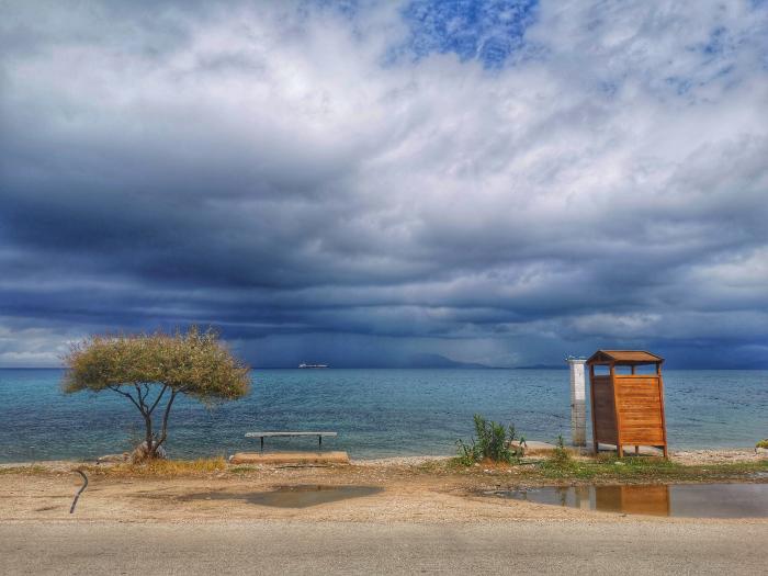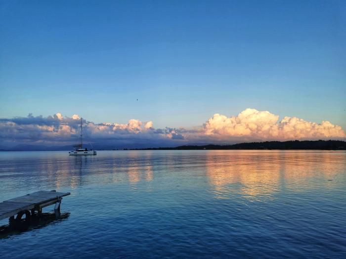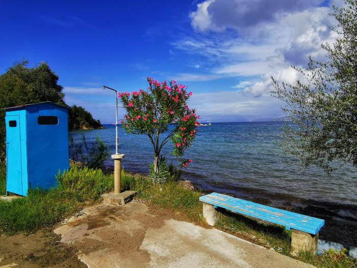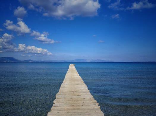 An der Ostküste, die an manchen Stellen nur einen Katzensprung von der Westküste entfernt liegt, ist das Wasser seichter – dafür kannst du nach Albanien oder aufs griechische Festland schauen und prima gegrillte Garides oder Nudeln mit Meeresfrüchten essen oder an der kleinen Küstenstraße direkt am Meer von Bouraki bis nach Petriki und weiterfahren. Hölzerne Stege führen ins Meer, die Fischerboote können dort festmachen und treiben an manchen Stellen wie von leichter Hand gemalt im Wasser. Der Duft von gegrilltem Fisch zieht übers Land, die Griechen sind freundlich und die Pauschaltouristen seltsam angezogen. Manchmal siehst du Menschen und weißt, wie sie heißen. Das spricht nicht für sie.