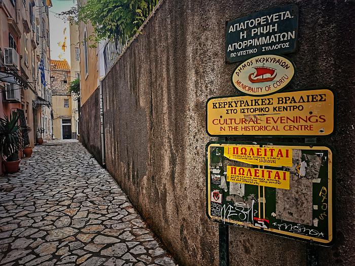 Und dann bin ich doch angekommen, im Hier und Jetzt, plauderte mit Vassilis und Georgia in einer kruden Mischung aus deutsch, englisch und griechisch. Wir tranken Wein auf dem Balkon, spazierten durch das Olivenhainchen ans Meer und trieben auf der Straße wieder zurück. Wir aßen eine fabelhafte Pizza im Ort und fotografierten niedliche zerzauste Katzen. Als wir am vorletzten Abend wieder in der Taverne Julia aufschlagen wollten, war der Bruder Stellas gerade dabei, sie zu verschließen, so dass wir nebenan Essen gingen, Berge von Bifteki verschlangen und am letzten Tag Mittags unsere liebgewonnene Taverne aufsuchten (in der wir übrigens vor vier Jahren das Spiel gegen Marseille schauten) und erfuhren, dass die Kids wieder in die Schule mussten – und die Saison langsam zu Ende ging. Wir versprachen hoch und heilig, im nächsten Jahr wiederzukommen, bekamen einen Ouzo in die Hände gedrückt und verabschiedeten uns mit einem Tränchen im Auge. Mittlerweile hatten wir uns für die morgige Nacht eine Unterkunft nahe des Airports in Korfu-Stadt gebucht, so dass wir den Mietwagen in aller Ruhe abgeben und durch die Stadt schlendern können, ohne noch einmal ohne eigenes Auto in den Süden zurück zu müssen.
