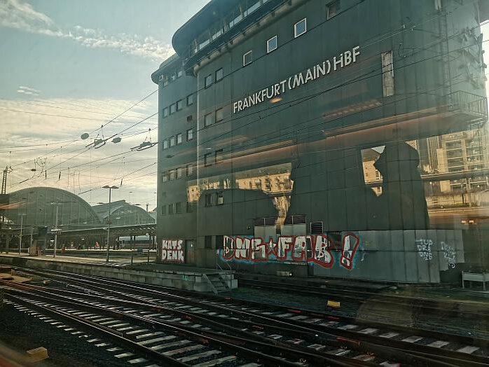 Ein letzter Café in der Lobby, dann brechen wir auf Richtung Hauptbahnhof, steigen an der Jannowitzbrücke noch einmal um, ein finaler Blick auf den Alex, dann rauschen wir am Bahnhof ein und mit dem ICE wieder raus. Unterwegs gelingt es mir kaum, die Orte der vorbeiziehenden Bahnhöfe zu entziffern. Sophie Zelmani singt „Travelling“, die neuen Kopfhörer dämpfen die Außenwelt, wir bekommen Schokolade mit der Aufschrift: „Lieblingsgast“. In Frankfurt nehmen wir die U4 bis zur Konsti und steigen dort um in die 12. Conrad ist jetzt Woolworth. Sonst scheint alles gleich.