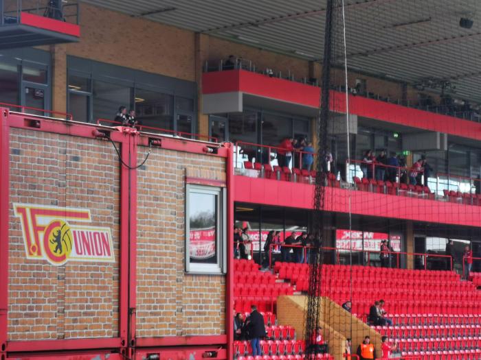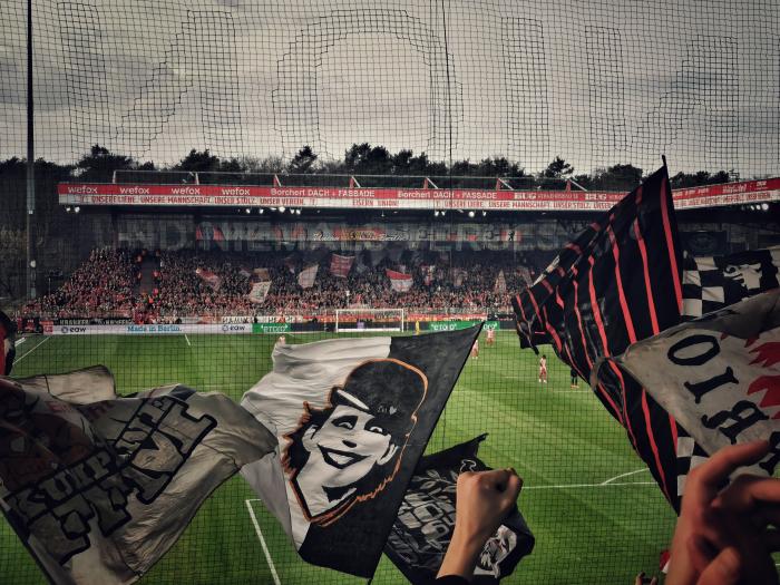 Der Dampfer biegt um die Ecke, die Töne verklingen, wir spazieren dem Stadion entgegen, sind guter Dinge und gut in der Zeit. Der Einlass erfolgt unspektakulär, die Bratwurst ist prima und peu a peu trudeln die Eintrachtfans ein. Wir wandern von unten nach oben, und stellen uns brav in die Reihe. Frank ist auch schon da, seine Mitreisende Heike kommt später. Fahnen werden uns später die Sicht verstellen, soviel ist sicher. Egal, wo du stehst. Bemerkenswert ist hier bei Union die Stadionmusik und der unaufgeregte Empfang, erinnert mich immer so ein bisschen an meine Zeit als Stadionsprecher bei den Amateuren, später U23. Die Playlist gibts sogar über Twitter auf Spotify. Diesmal erfreuen uns unter anderem Rihanna, Placebo, Mando Diao und The Verve – wobei Bittersweet Symphony schon ein toller Song ist, bei mir aber sofort eine Leverkusen-Allergie auslöst. Bei der Mannschaftsvorstellung der Eisernen rufen die Fans bei jedem Spieler „Fußballgott“ und sogar Christian Lenz, der seit zwei Jahren bei der Eintracht kickt und damals mit Union aufgestiegen ist, wird von heimischer Seite ausgiebig gewürdigt. Dann singt Nina Hagen „Eisern Union“ – allerdings nicht live. Es ist stets aufs Neue ein unterhaltsames Fußballerlebnis, hier in der Alten Försterei aufzuschlagen, auch wenn kurz nach Anpfiff alle Fahnen ausgepackt werden und somit die Sicht aufs sportliche Geschehen von überschaubarer Überschaubarkeit ist. Die Eintracht scheint in Hälfte eins zwei schöne Chancen zu versemmeln, und da auch Union nicht trifft, geht es mit dem 0:0 zum Halbzeittee. Ich würde gerne mal wissen, wann die Eintracht letztmals wirklich Tee zur Pause genommen hat. Dazu müsste man wohl mal Egon Loy fragen.