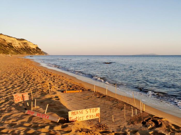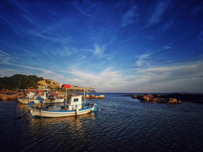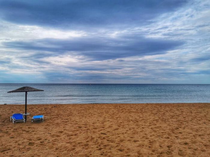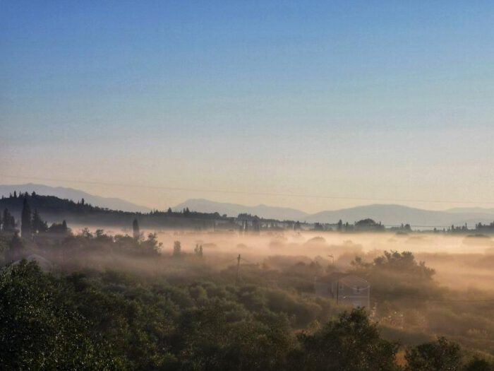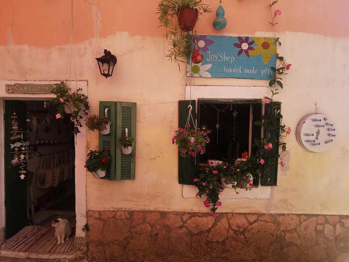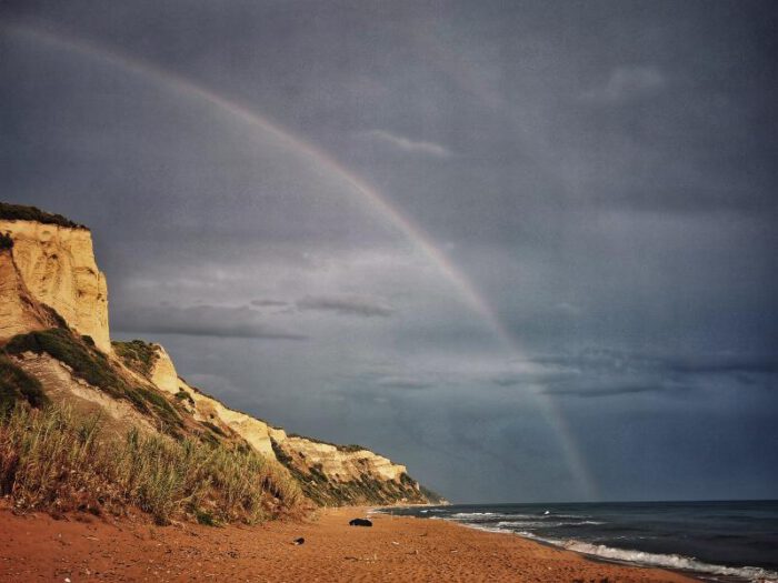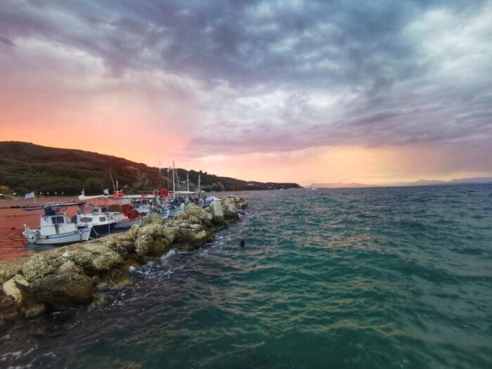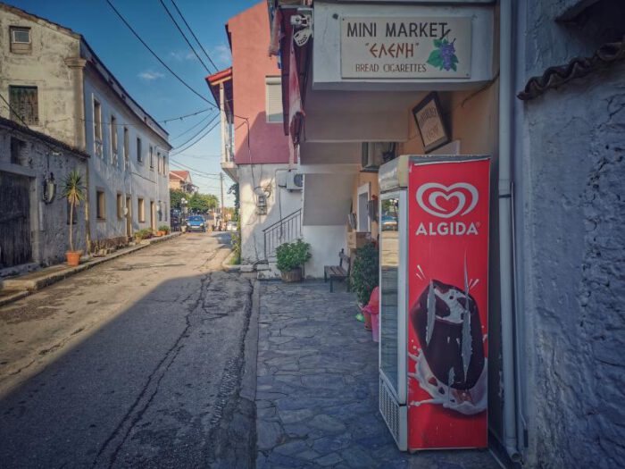 Flug und Übernachtung sind nicht allzuteuer, die Unterkunft ist sehr relaxed, die Gastgeber nunmehr fast schon Freunde, der Weg zum Strand durch einen Olivenhain zu Fuß machbar, und ins Dorf hoch sind es auch keine 10 Minuten. Dort gibt es zwei taverneske Cafés eine fantastische Pizzeria und zwei Minimärkte, wobei wir regelmäßig im kleineren Notwendiges einkaufen, für größere Einkäufe fahren wir ein paar Minuten nach Lefkimmi, der nächst größere Ort, der kaum Touristen beherbergt. Überhaupt ist der Südwesten im September recht ruhig. Natürlich drängen sich an manchen Spots auch hier die Urlauber, aber wenn du zur richtigen Zeit unterwegs bist, oder an den richtigen Orten, hast du auch in Meerestavernen oder am Sandstrand deine Ruhe. Das ist ja das Schöne an den Menschen, sie legen sich alle in der brütenden Hitze an den Strand, mieten sich alle für Geld Liegen und Sonnenschirme und können den heißen Sand kaum betreten. Am späten Nachmittag gehen sie alle dann erschöpft nach Hause, jetzt kannst du dich entspannt in den Sand legen, brauchst keinen Sonnenschirm, und läufst später in den Sonnenuntergang. Dabei musst du von Zeit zu Zeit aufpassen, dass dir kein Instapärchen vor die Linse springt. Alles in allem kann ich sagen, dass Korfu sehr unterschiedlich ist und es viele Orte gibt, vor allem je nördlicher du kommst, die nicht zu meinen Lieblingsplätzen gehören – aber rund um unser kleines Dorf bin ich schon ausgesprochen gerne. Von mir aus auch wieder im nächsten Jahr. Wir haben neue Tavernen und Cafés ausprobiert, neue Wege entdeckt und uns auf vertrautem Terrain bewegt. Dieses Jahr war geprägt von einigen Wandertouren, von ein paar Tagen Regen zu Beginn und von einer entspannten Zeit. Und zum dritten Mal traf ich in Korfu auf Bekannte. Diesmal Alex und Andi, die sowohl beim Hin- als auch beim Rückflug im gleichen Flieger saßen.