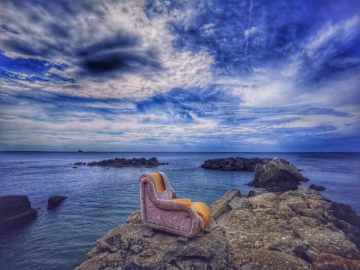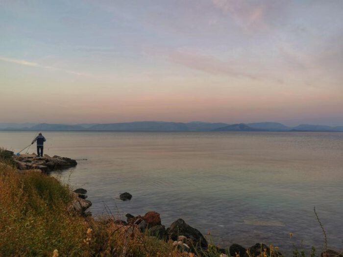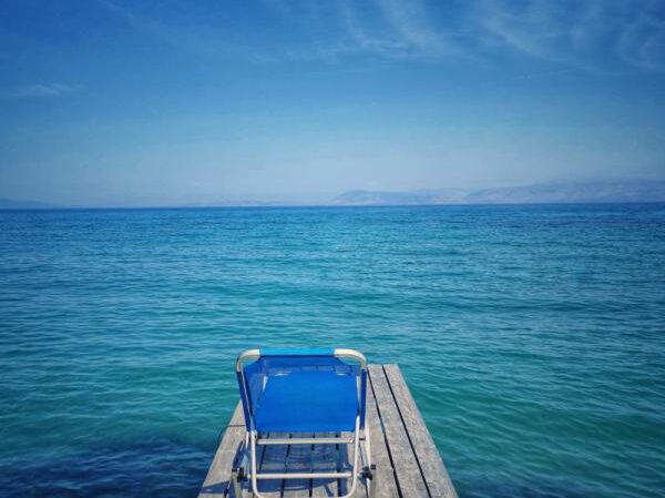 Die andere Geschichte klingt ein wenig skurriler. Wir gondelten mit dem Auto die Südostküste von Boukari bis Petriti entlang, untermalt von den Klängen Pablus (So weit weg wie es geht), Weils (du) und Franceys (Letzten Sommer). Die kleine Straße führt direkt am Wasser entlang, wenn dir jemand entgegen kommt, muss eine Lösung gefunden werden – und es findet sich stets auch eine. In Petriti bog der Weg ins Landesinnere, wir fuhren hoch bis nach Notos und von dort wieder nach unten. Bei der Taverne Electras Garden fanden wir einen eleganten Parkplatz und stiegen durch die Stufen der Taverne, die auf einigen Ebenen Sitzpätze mit fantastischem Ausblick bietet und unten dazu ein paar Liegen an der kleinen Bucht, hinunter. Ein Steg führt ins Meer, von dessen Ende eine rostige Leiter ins „Tiefe“ führt. Wir besorgten uns einen Café, legten uns auf freie Liegen, schwammen an der Ostküste mit Blick aufs Festland und genossen die Ruhe, wie die paar Menschen neben uns auch. Ganz vorne auf den Steg legte sich eine junge Frau mit gelben Bikini auf ihr Handtuch, sonnte sich und es war Sommer.