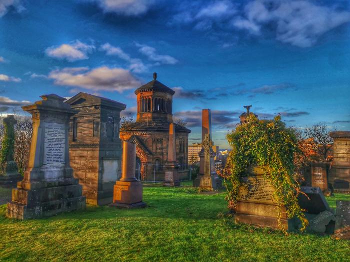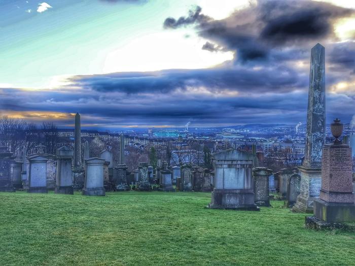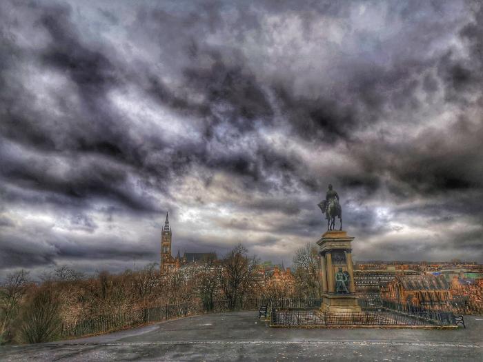 Das Angebot der Mitnahme in die Stadt nahmen wir dankend an und so stapften wir nach zwei Stunden Flug und Passkontrolle durch den Regen zur Mietwagenstation und stiegen wenig später in einen nagelneuen MG – wenig überraschend befand sich das Lenkrad auf der rechten Seite. Irritierend, dass uns ein Schotte in kurzer Hose und Flip Flops entgegen kam. Kalle brachte uns hingegen sicher in die Unterkunft nahe der Necropolis, dem alten Friedhofs in Glasgow. Wir bedankten uns für den hervorragenden Service, wünschten den beiden noch eine gute Fahrt, besorgten uns den Wohnungsschlüssel, der im gegenüberliegenden Minimarkt für uns hinterlegt wurde und marschierten durchs kühle Treppenhaus die steinernen Stufen in den zweiten Stock hinauf. Dort lebt Shona, die uns ein Zimmer ihrer geräumigen Wohnung für die nächsten vier Nächte vermietet hat. Aus unserem Fenster blicken wir über einen kleinen Hinterhof auf die Totenstadt. Elstern und Eichhörnchen sind unsere Nachbarn. Shona arbeitet. Unser Zimmer ist ansprechend aber kühl, die Küche im 70s-Style und das Bad ist sauber, wir haben es gut getroffen. Nur die Fußbodenheizung wie in Helsinki wird schmerzlich vermisst