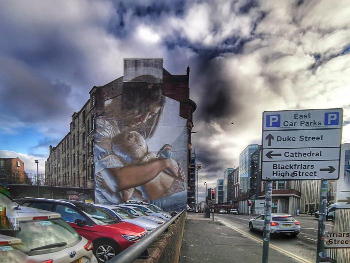 Das erste Mal Schottland, das erste Mal Glasgow – wir sind gespannt und brechen auf zur ersten Erkundung. Leider können wir den Friedhof nicht durchqueren, so laufen wir außen daran vorbei. Direkt angrenzend liegt das weitläufige Gelände der Tennant Brauerei, an deren Außenwand die ersten Graffiti leuchten, allerdings Auftragsarbeiten für die Brauerei, von daher zu vernachlässigen. Wir umrunden Tennant, bis wir wieder am Friedhof sind, von dort führt eine Brücke zur Kathedrale, deren Spitze unfotogen eingerüstet ist. Anschließend laufen wir die High Street runter, bis wir tatsächlich das erste Mural entdecken, erinnernd an St Mungo, einer Legende, die einst an der Stelle der heutigen Kathedrale beerdigt wurde und heute deren Namensgeber ist.