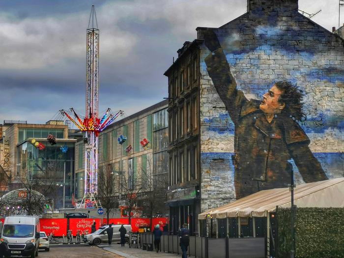Wir treiben durch die Stadt, trinken Tee und Kaffee, bestaunen die leuchtenden Weihnachtsmärkte hinter der mondänen Buchanan Street oder am George Square, wo in einem Festzelt zig Schotten mit Schoppen lautstark „I will survive“ mitsingen. Der George Square ist der zentrale Platz Glasgows, jetzt stehen hier Karussells und Buden, inmitten des Trubels thront Sir Walter Scott, der einst Ivanhoe geschrieben hat, und überblickt das gesellige Treiben. Das angrenzende Rathaus wird in bunten Farben angeleuchtet. Es ist keine vier Uhr und stockdunkel.